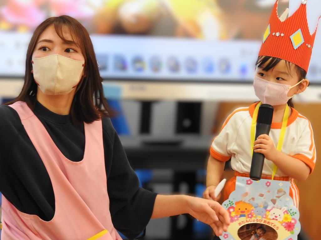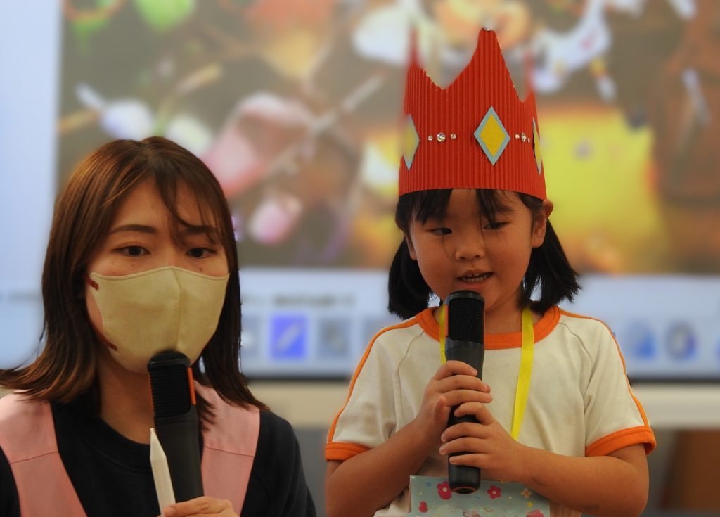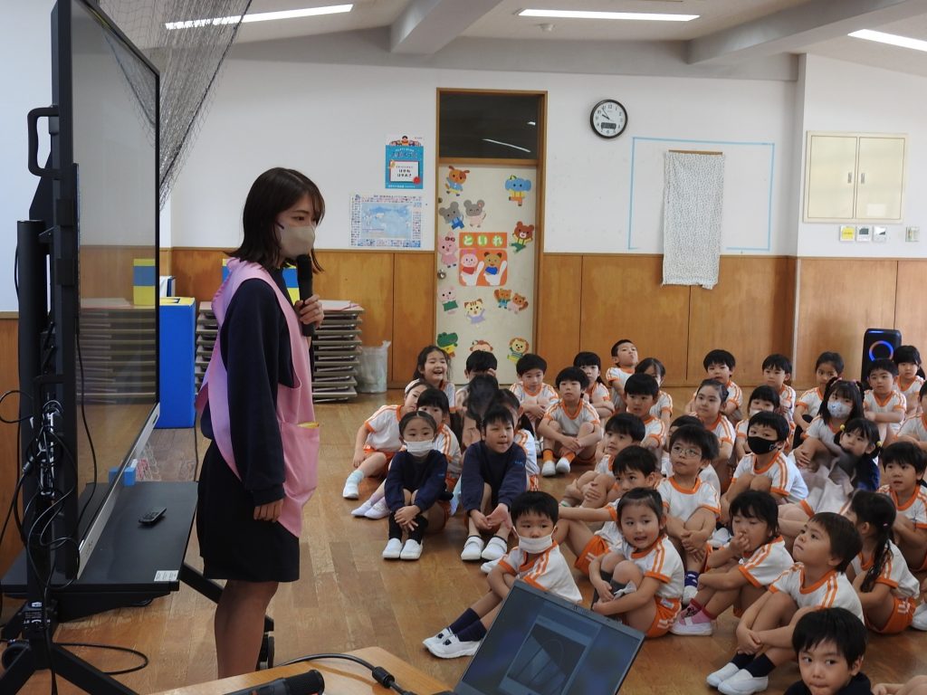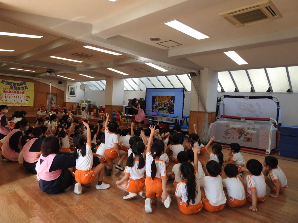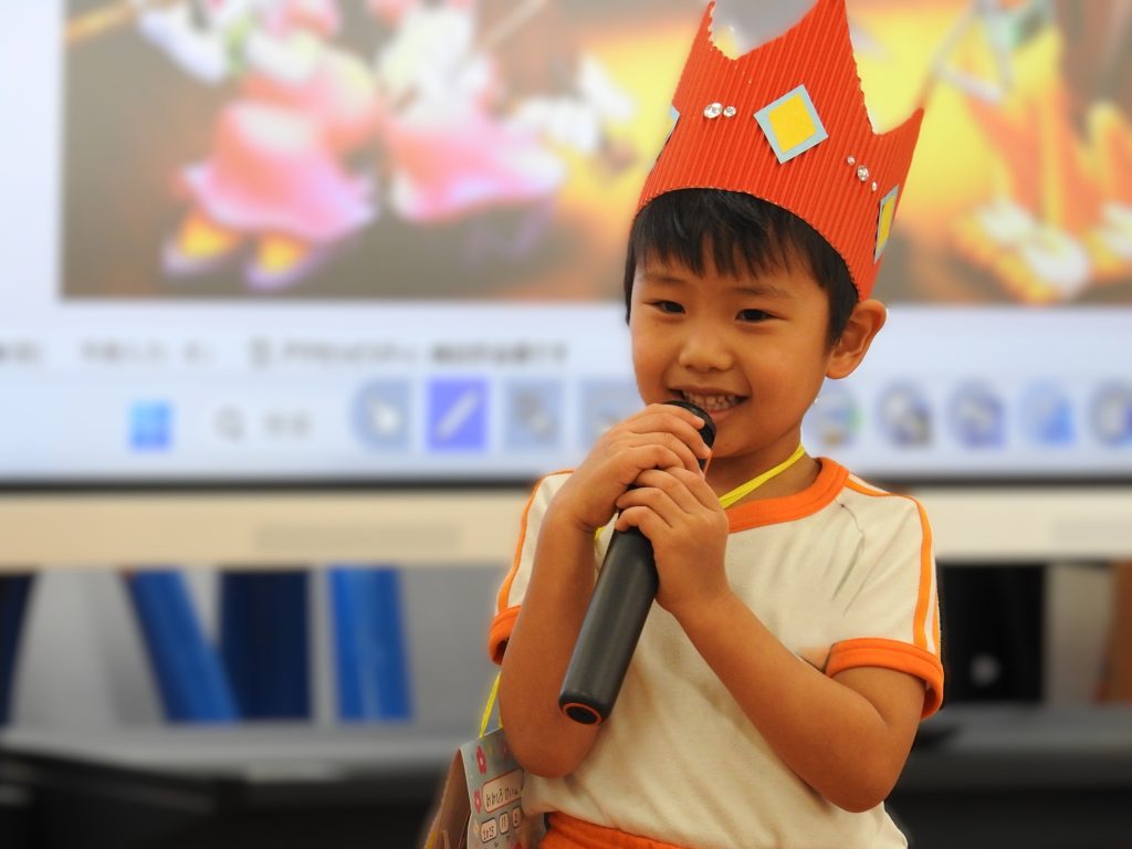 今日は11月のお誕生日会でした。今日のゲームは宝さがしです。電子黒板で表示された絵の中から宝物を見つけ、まるで囲みます。その宝物によって答える質問が違います。電子黒板にもこんな活用法があるのかと感心しきりです。