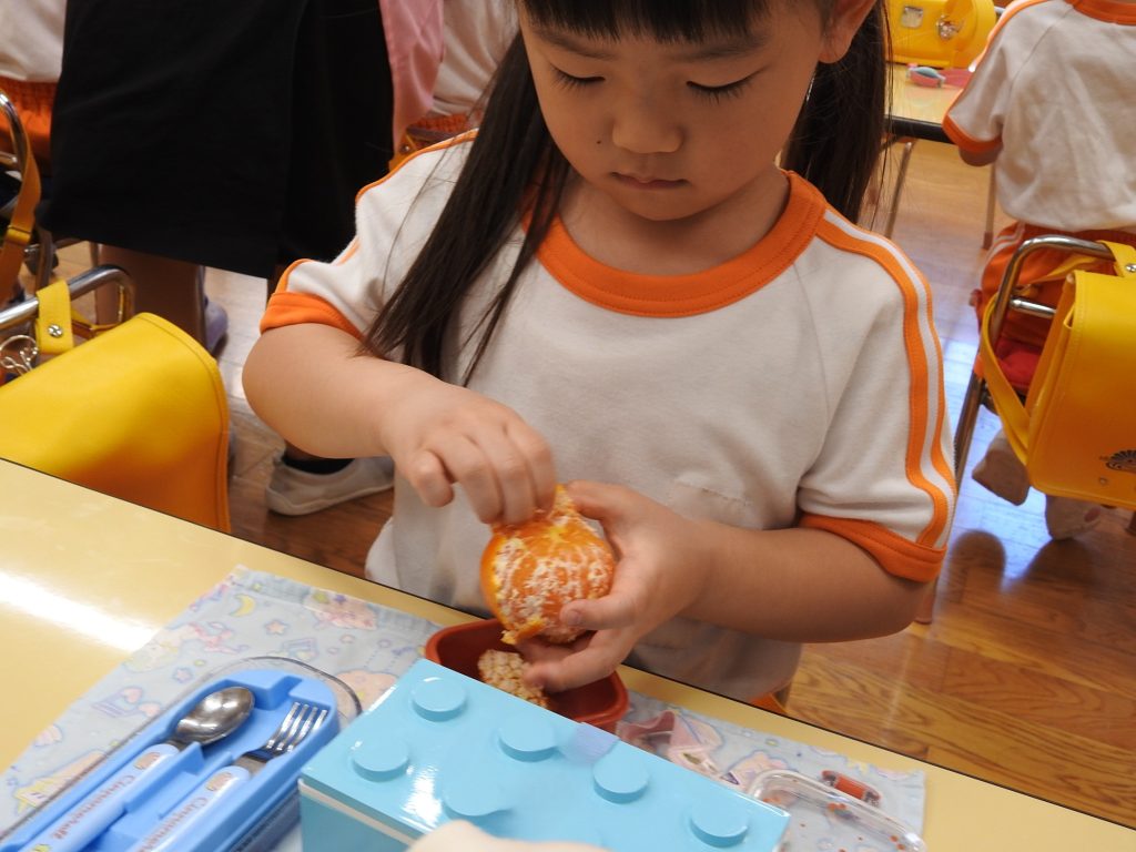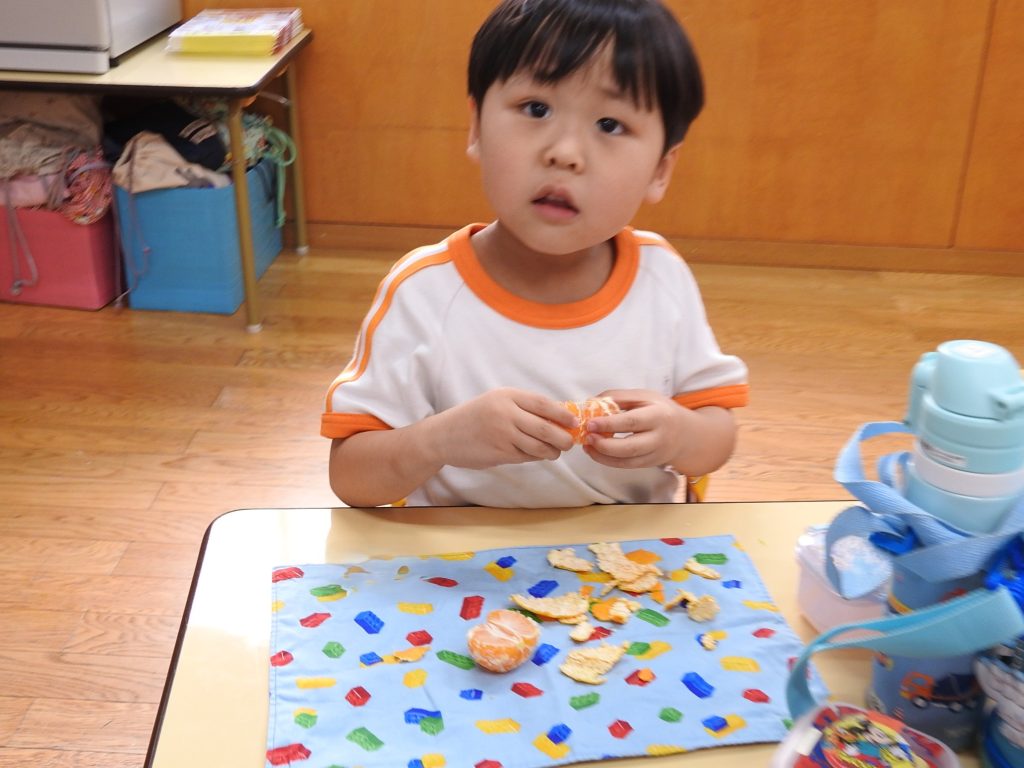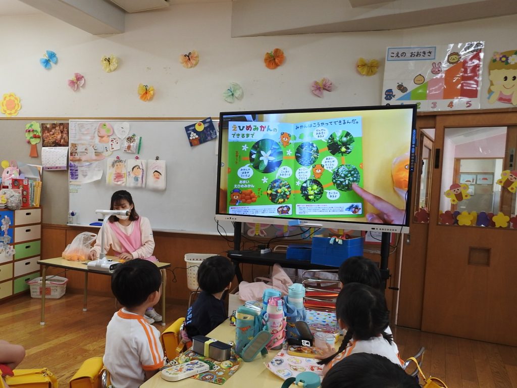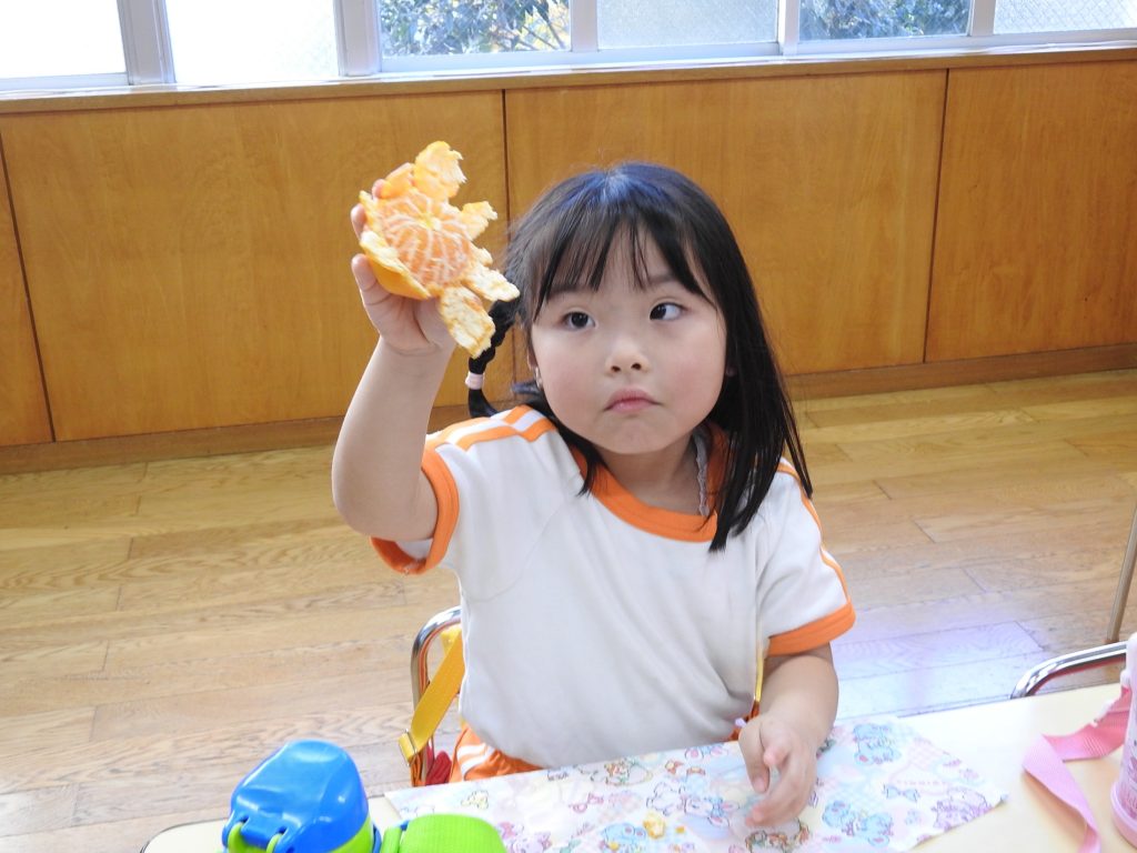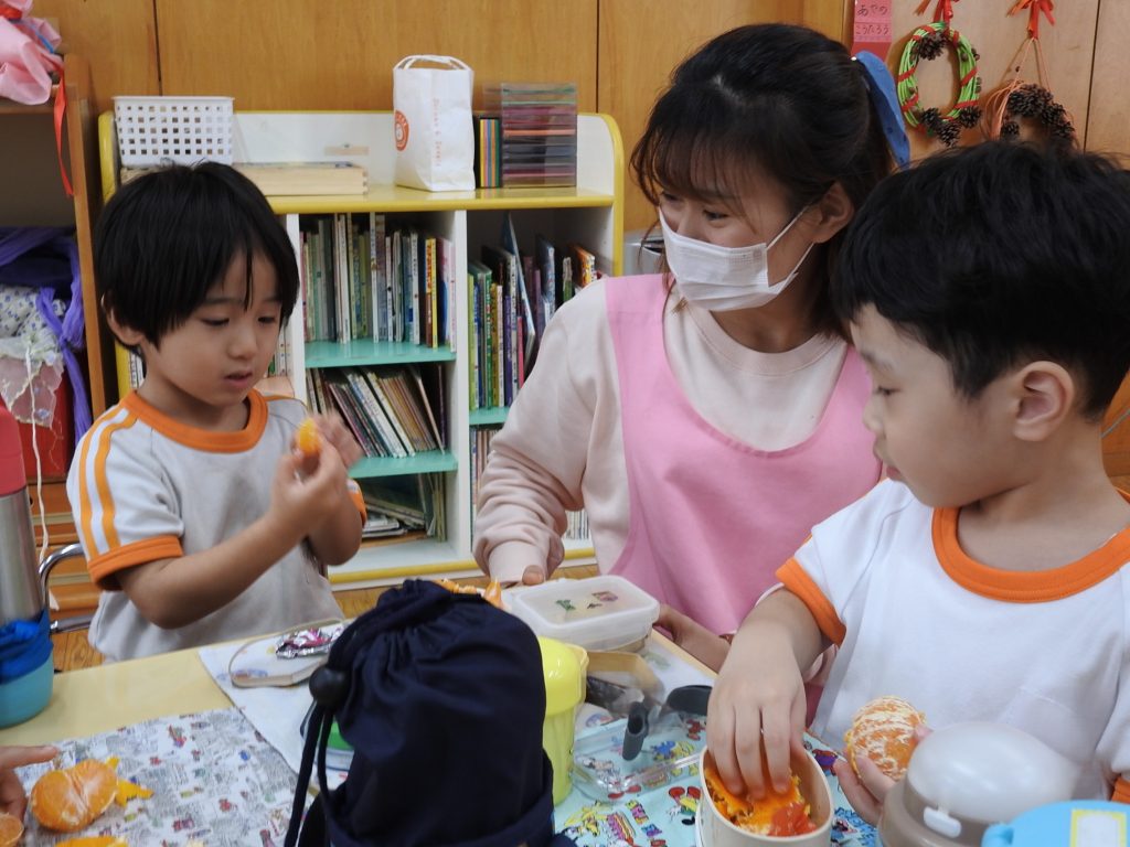 年少組でも美味しい愛媛みかんをいただきました。担任の先生が電子黒板を使って丁寧に皮のむき方を教えてくれます。小さい手で一生懸命みかんの皮をむきました。「できた!」とうれしそうな顔です。年少の園児もみかんが大好きになりました。「ひとつあげる!」と園長にもおすそ分けしてくれました。うれしい!