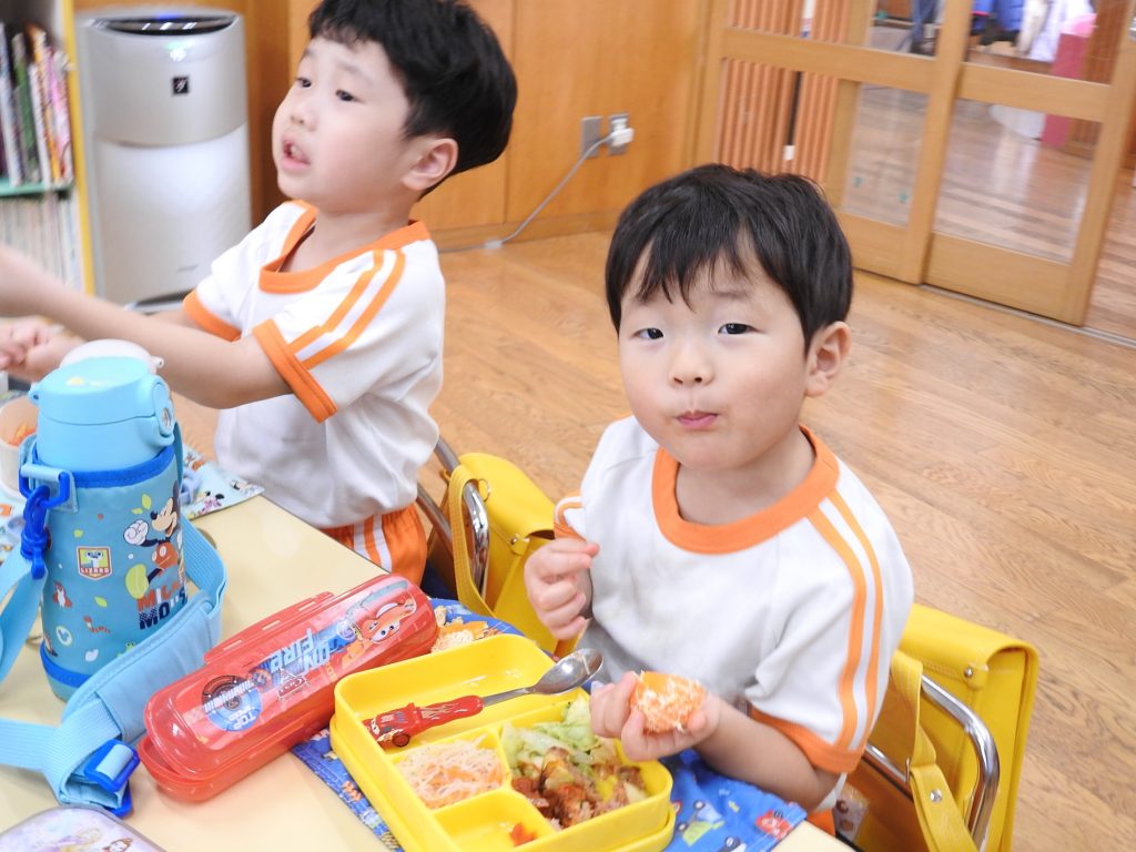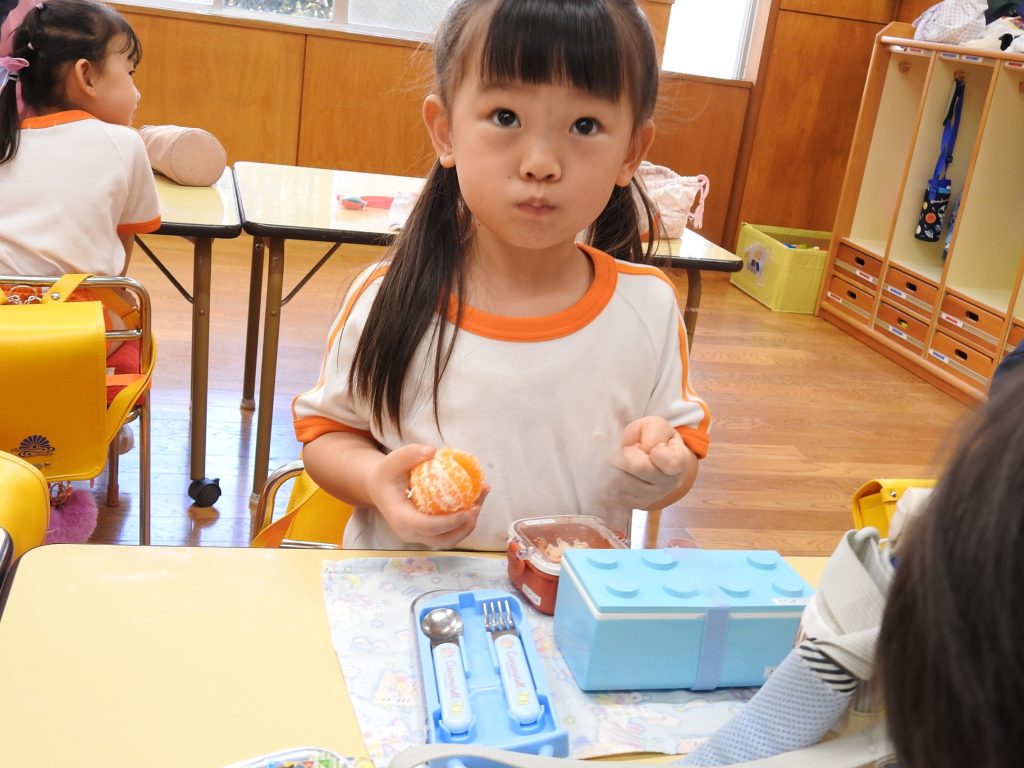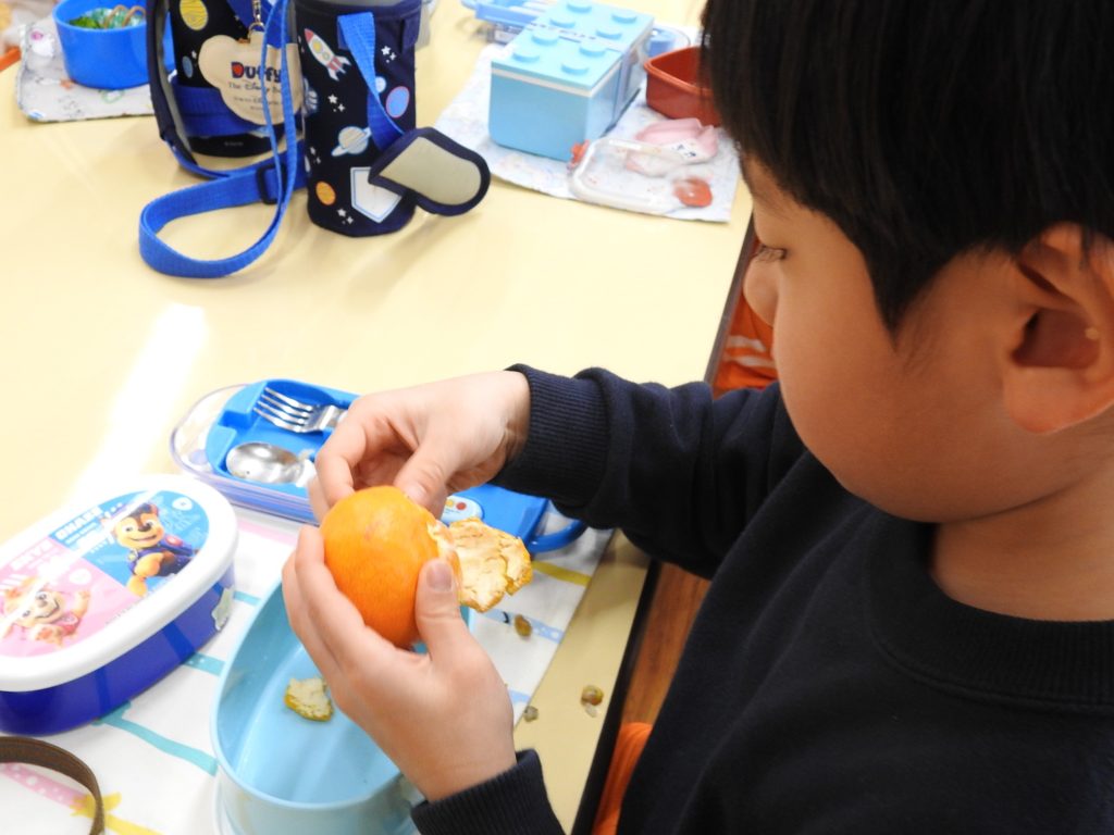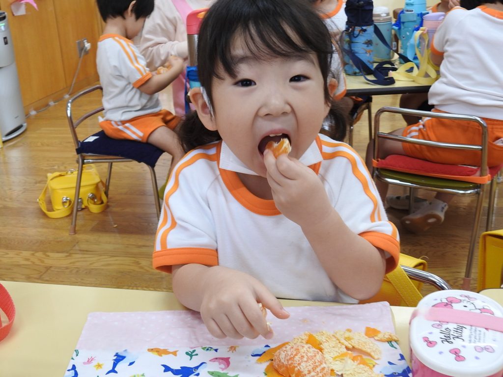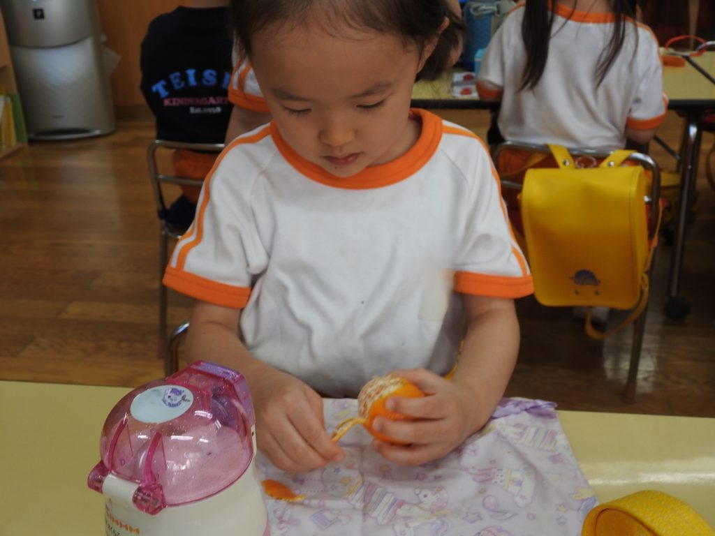 年少組でも美味しい愛媛みかんをいただきました。担任の先生が電子黒板を使って丁寧に皮のむき方を教えてくれます。小さい手で一生懸命みかんの皮をむきました。「できた!」とうれしそうな顔です。年少の園児もみかんが大好きになりました。「ひとつあげる!」と園長にもおすそ分けしてくれました。うれしい!
