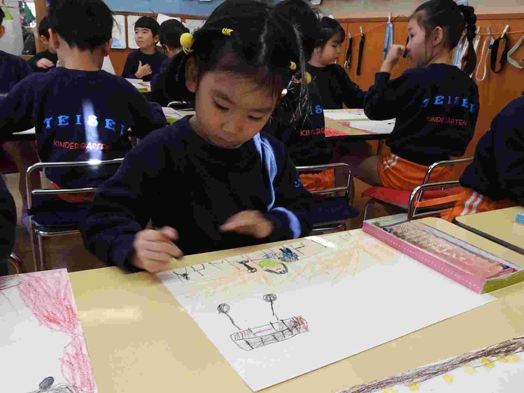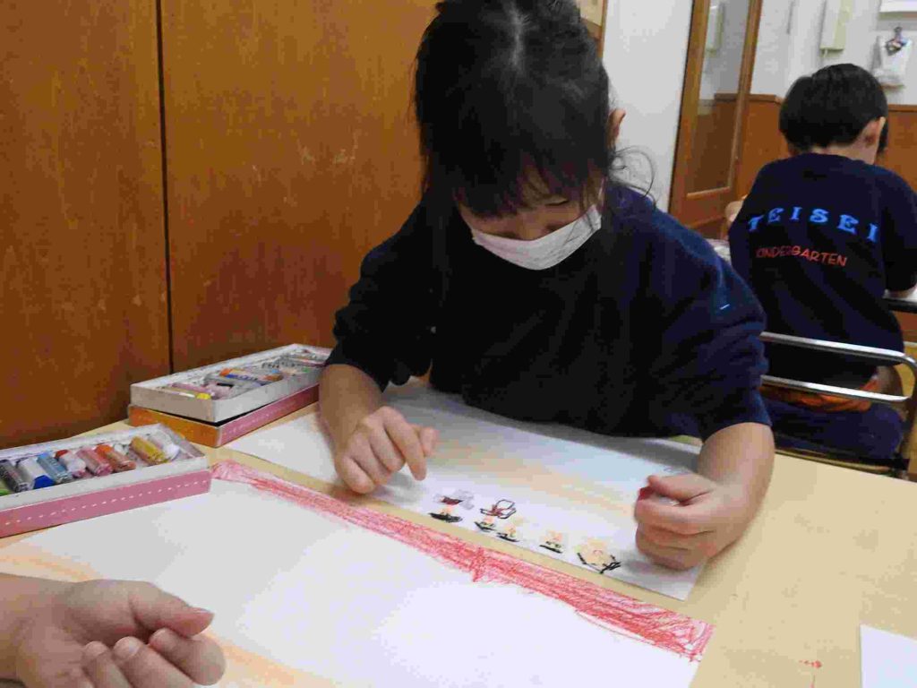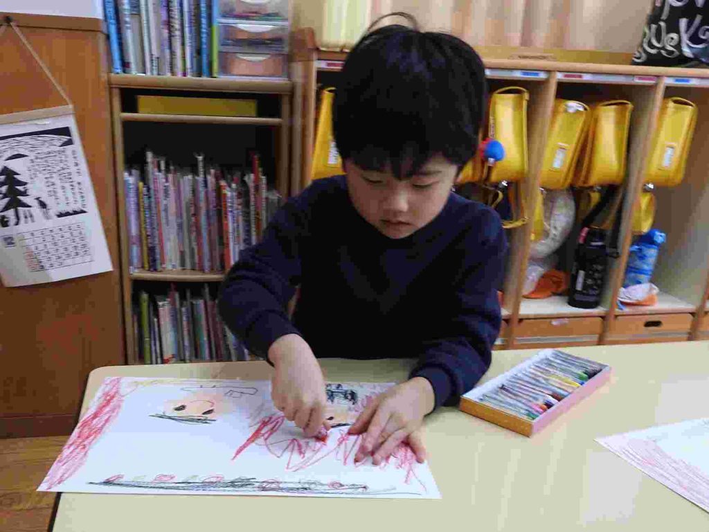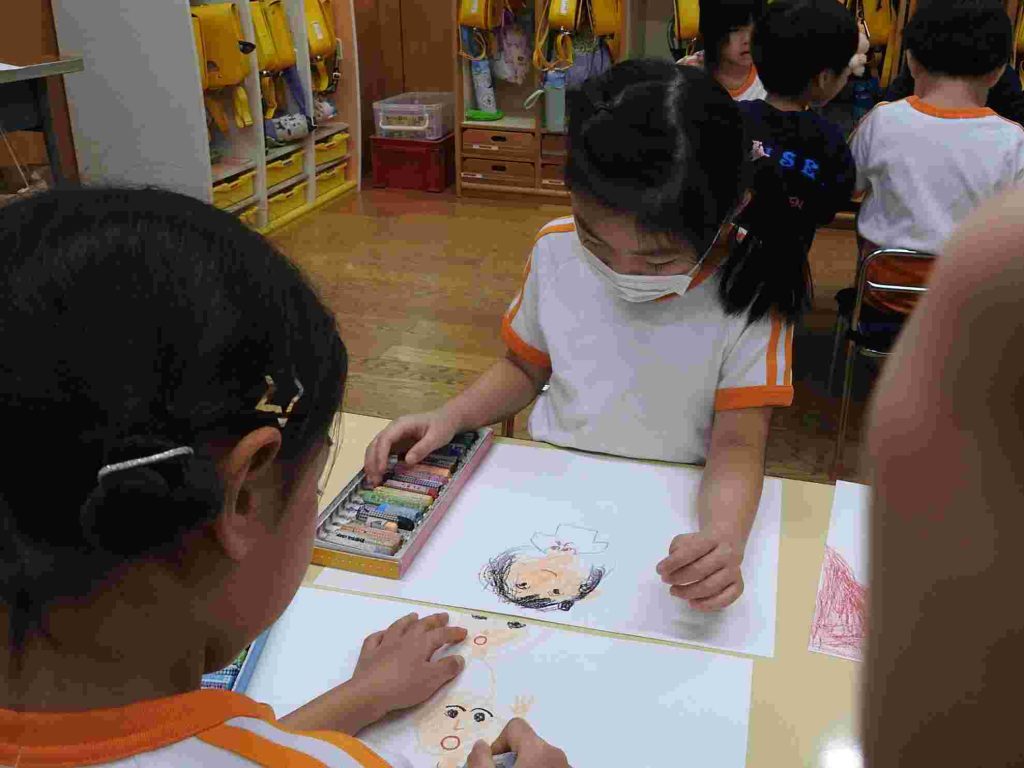 今日は、どの学年も音楽会の思い出画を描きました。どの保育室を回っても園児は意欲満々で、クレヨンを持ったらすぐ画用紙に描き始めていました。年長組では、空間と人の大きさを意識すること、腕や手を正確に描くことを指導しています。手話をしている手を描くときは、それが何を表しているのかがわかるように、という点も指導しました。園児は集中して絵に取り組みます。劇発表会の時より、さらに上手になっています。