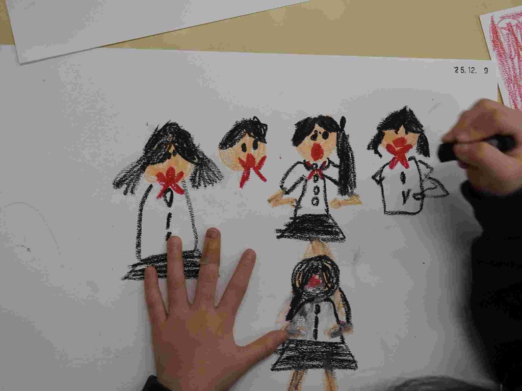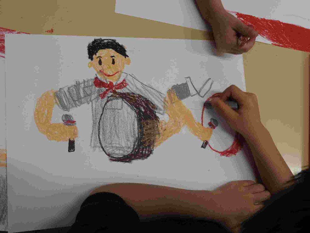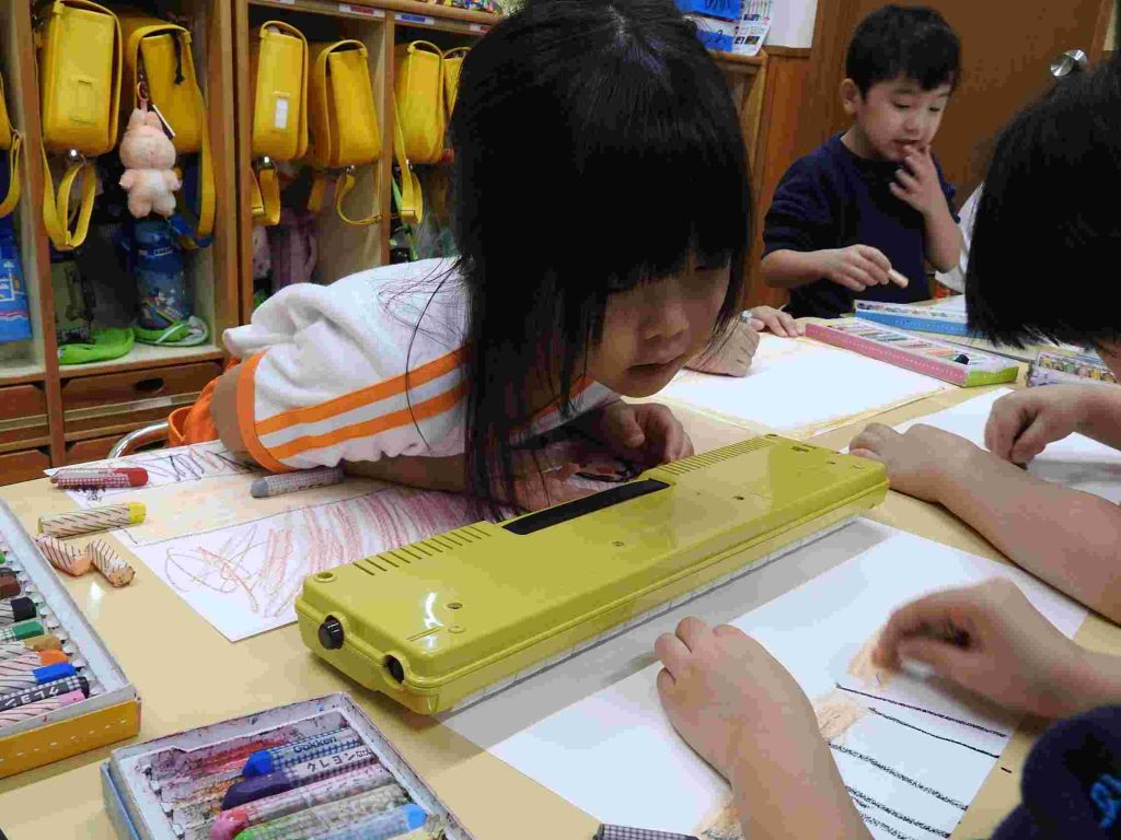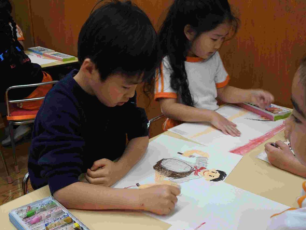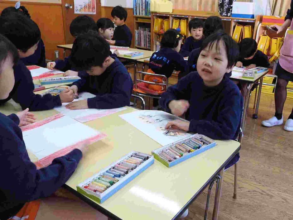 今日は、どの学年も音楽会の思い出画を描きました。どの保育室を回っても園児は意欲満々で、クレヨンを持ったらすぐ画用紙に描き始めていました。年長組では、空間と人の大きさを意識すること、腕や手を正確に描くことを指導しています。手話をしている手を描くときは、それが何を表しているのかがわかるように、という点も指導しました。園児は集中して絵に取り組みます。劇発表会の時より、さらに上手になっています。