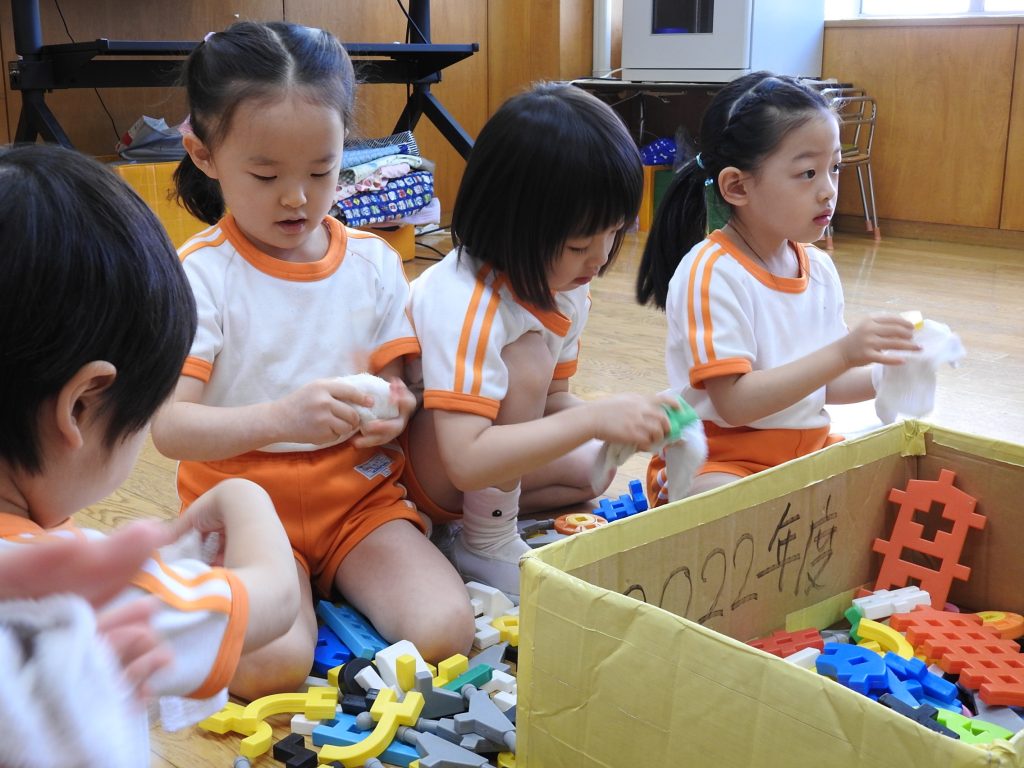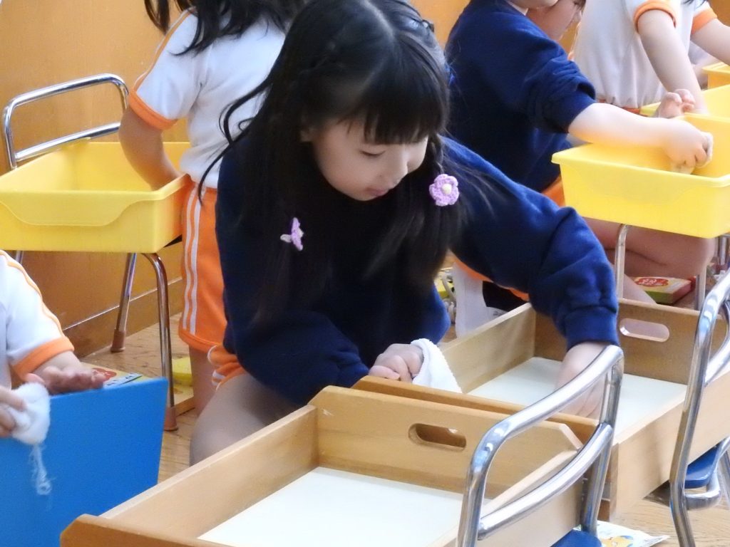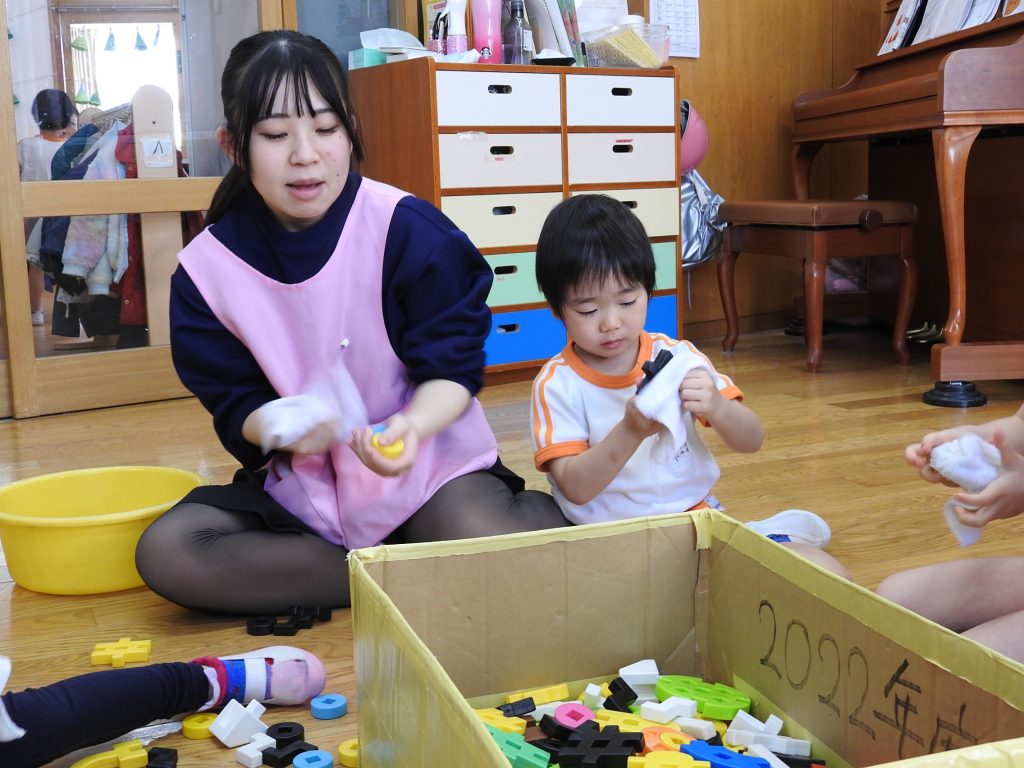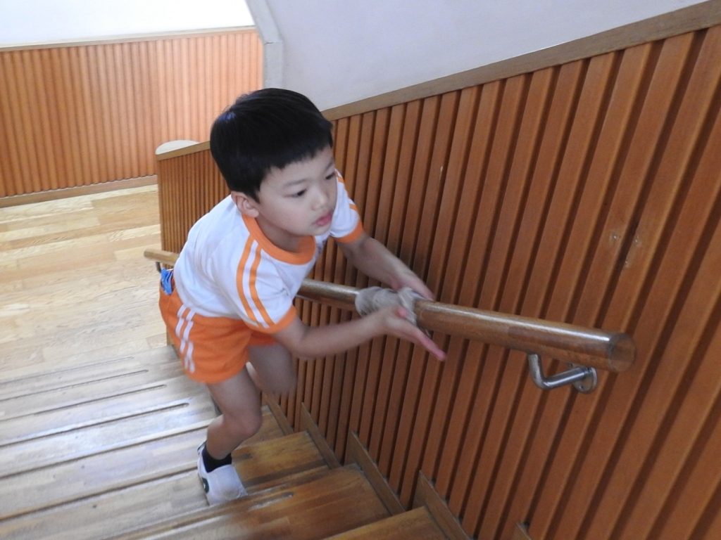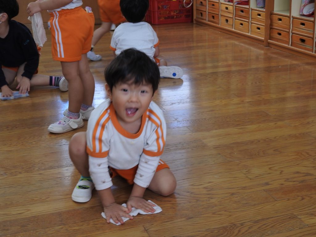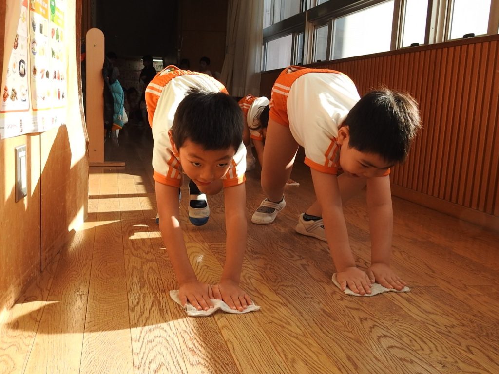 今日は大掃除。自分が使っているものをきれいにします。さらに、みんなで遊んでいるおもちゃや廊下、階段もきれいにしています。幼稚園や仲間を大切にしようとする心が育っています。