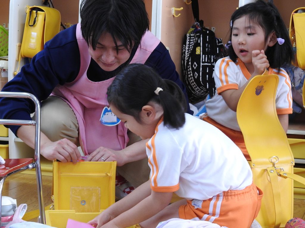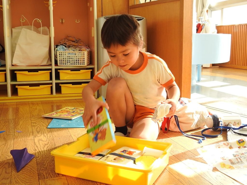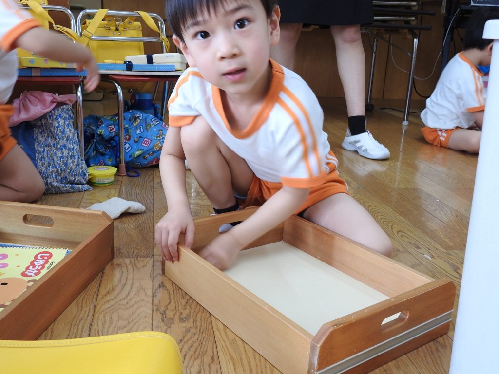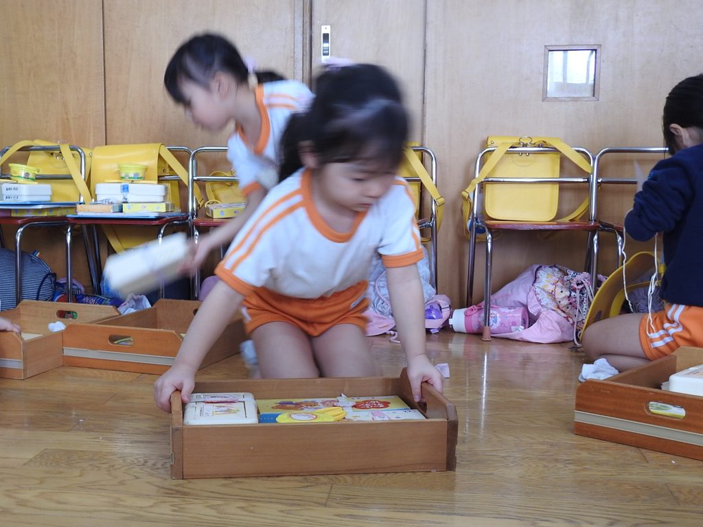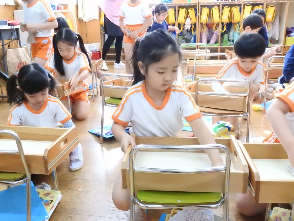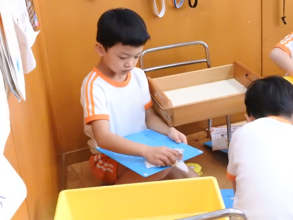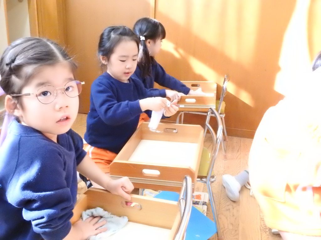 今日は大掃除。自分が使っているものをきれいにします。さらに、みんなで遊んでいるおもちゃや廊下、階段もきれいにしています。幼稚園や仲間を大切にしようとする心が育っています。