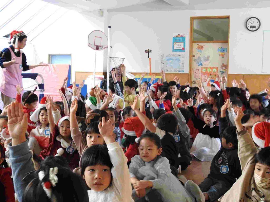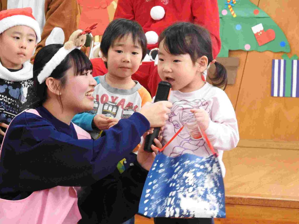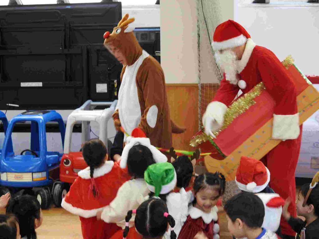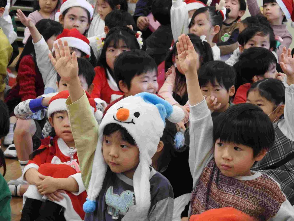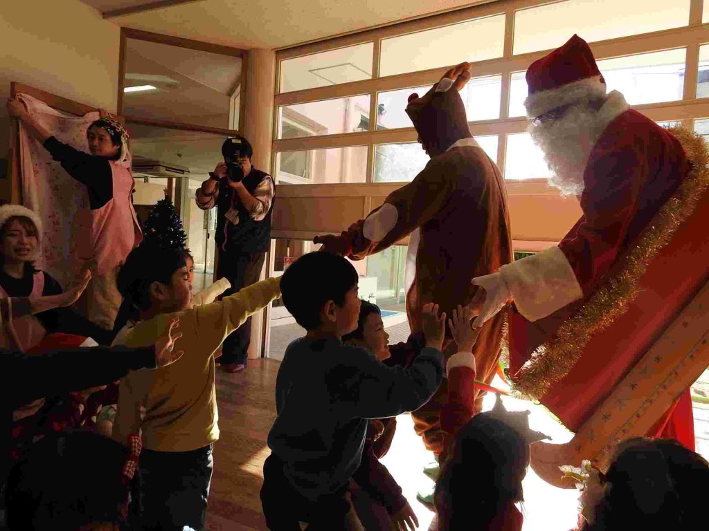今年も貞静幼稚園にサンタクロースとトナカイがやってきました。今年のサンタクロースはフィンランドの村からやってきたとのことで、英語と日本語を交え、園児からの質問に答えてくれました。サンタさんからのプレセントのお礼に、園児は「サンタが街にやってくる」の歌を、先生方は「アナと雪の女王」から「雪だるまつくろう」「レット・イット・ゴー」の合奏を贈りました。