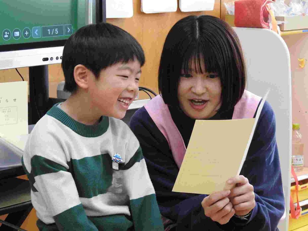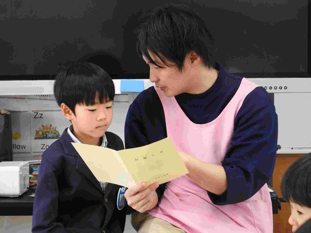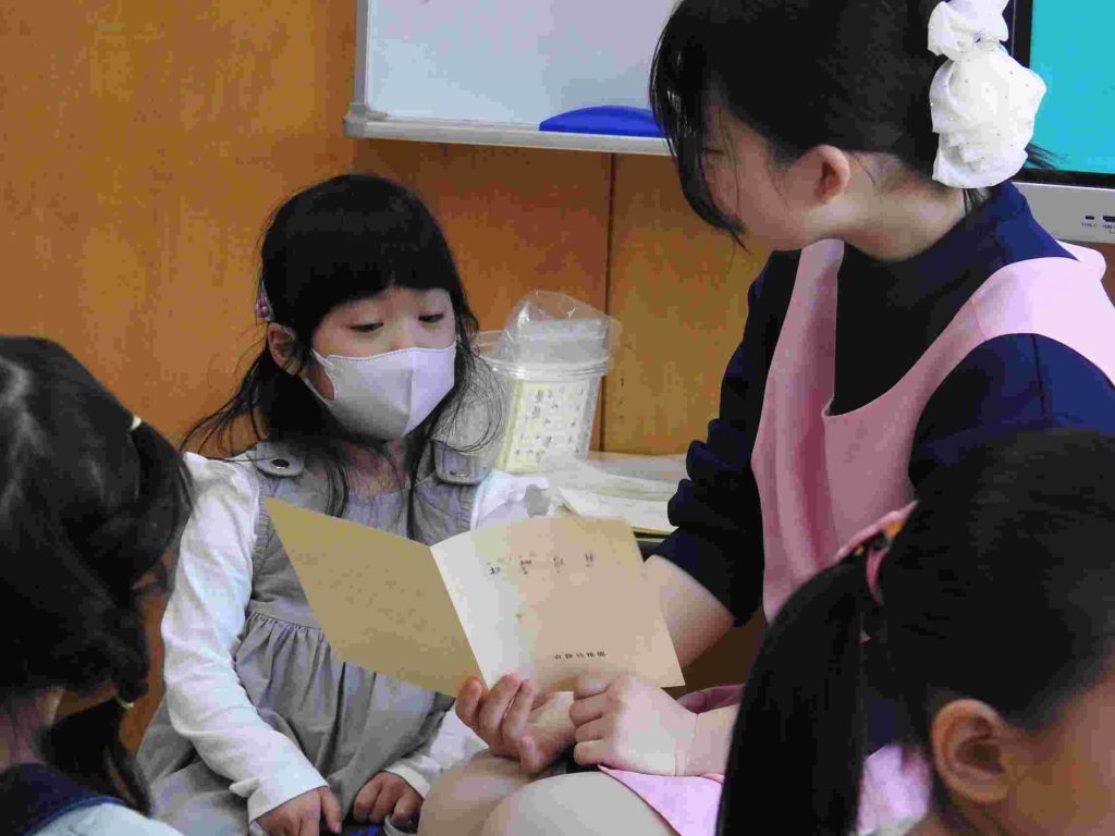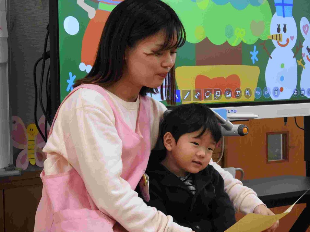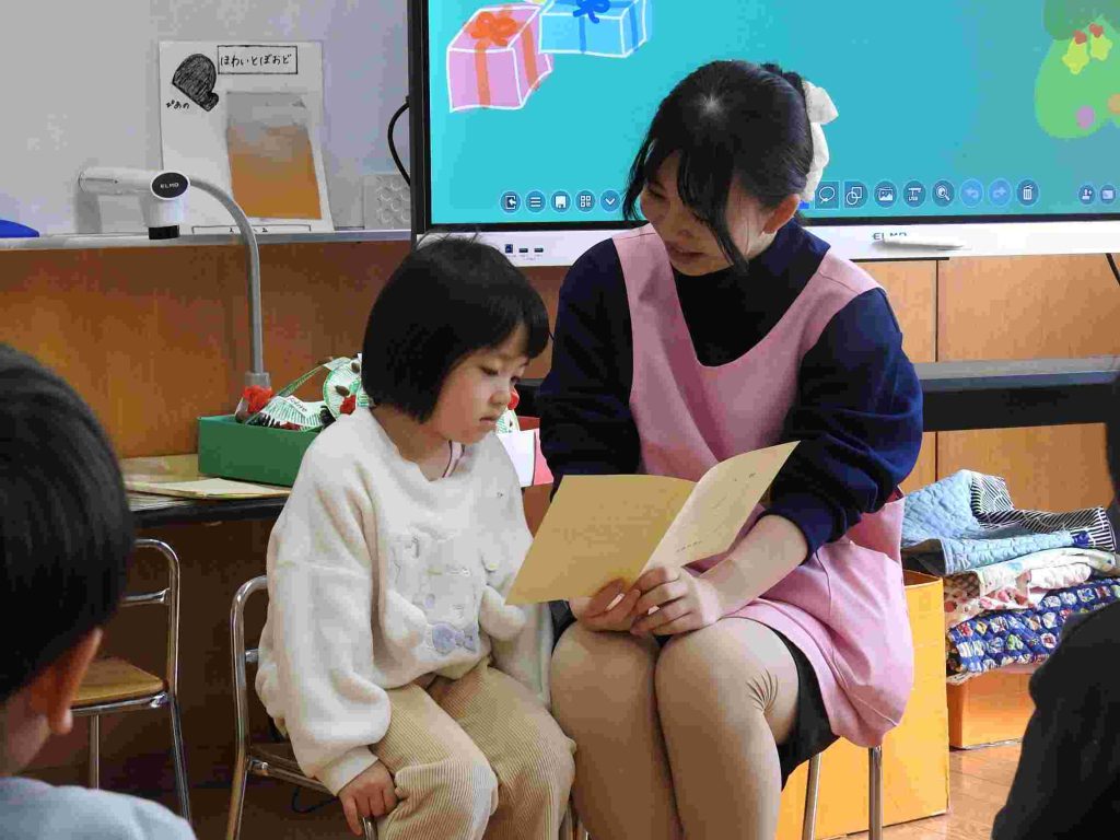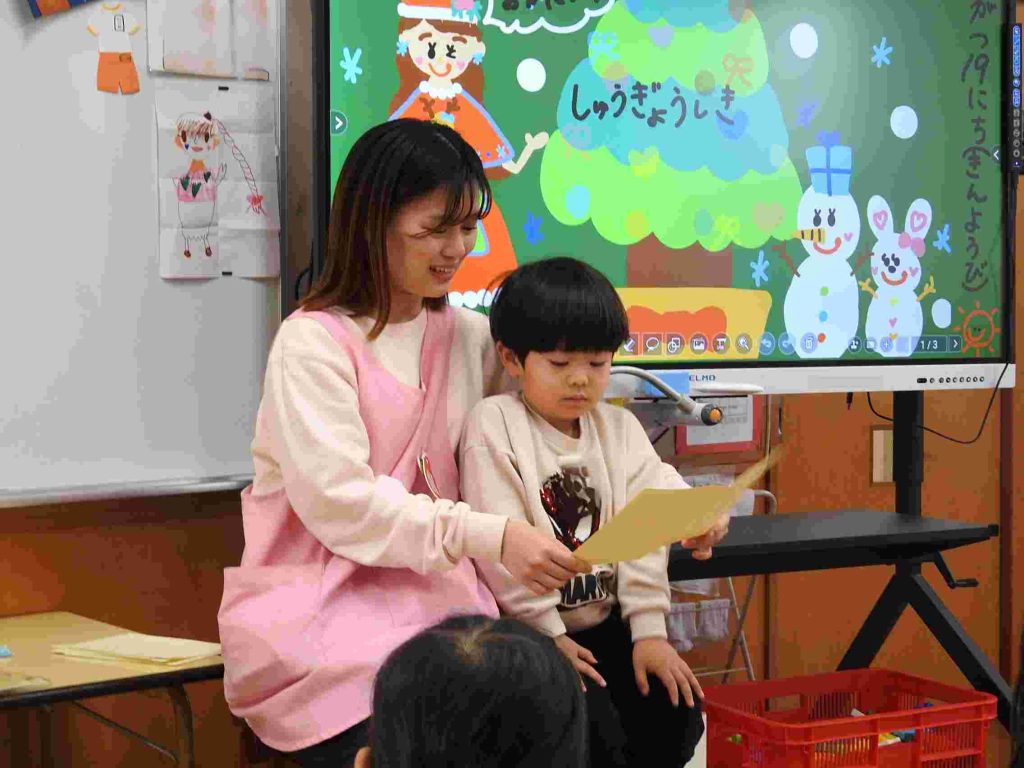 終業式の後、各クラスで2学期のおしらせ(通知表)を一人ひとりに渡しました。貞静幼稚園ではおしらせの内容を園児一人ひとりにわかりやすく伝えています。また、園児と横並びで渡すことで園児の気持ちに共感する姿勢臨んでいます。その学期にがんばったことや成長したことなどをその園児やクラスのみんなに伝えます。がんばったことや成長したことをみんなにも知らせることで自己肯定感をはぐくむこともねらいの一つです。園児と担任の先生の一番いい場面です。園児のうれしい顔、先生と目を合わせてほほ笑む様子をご覧ください。