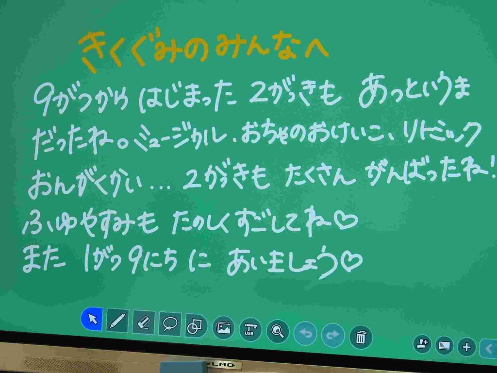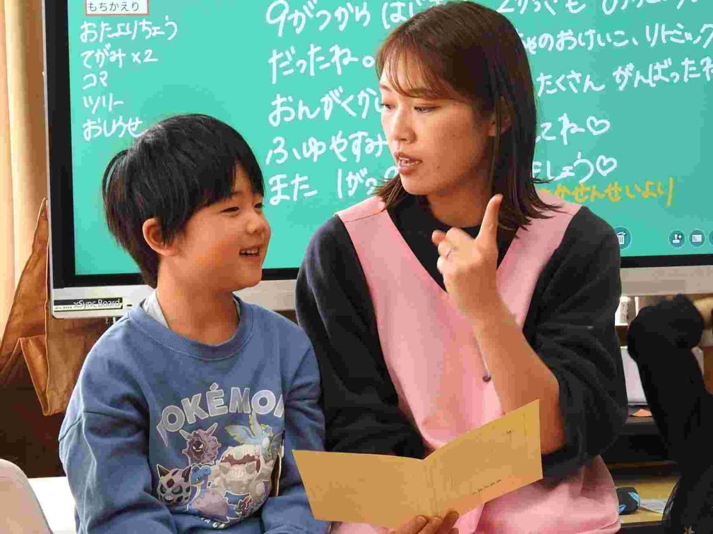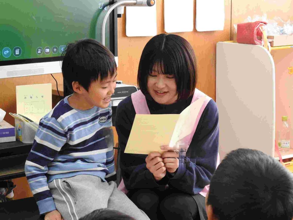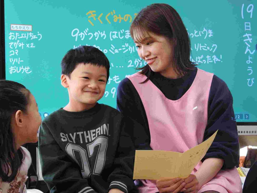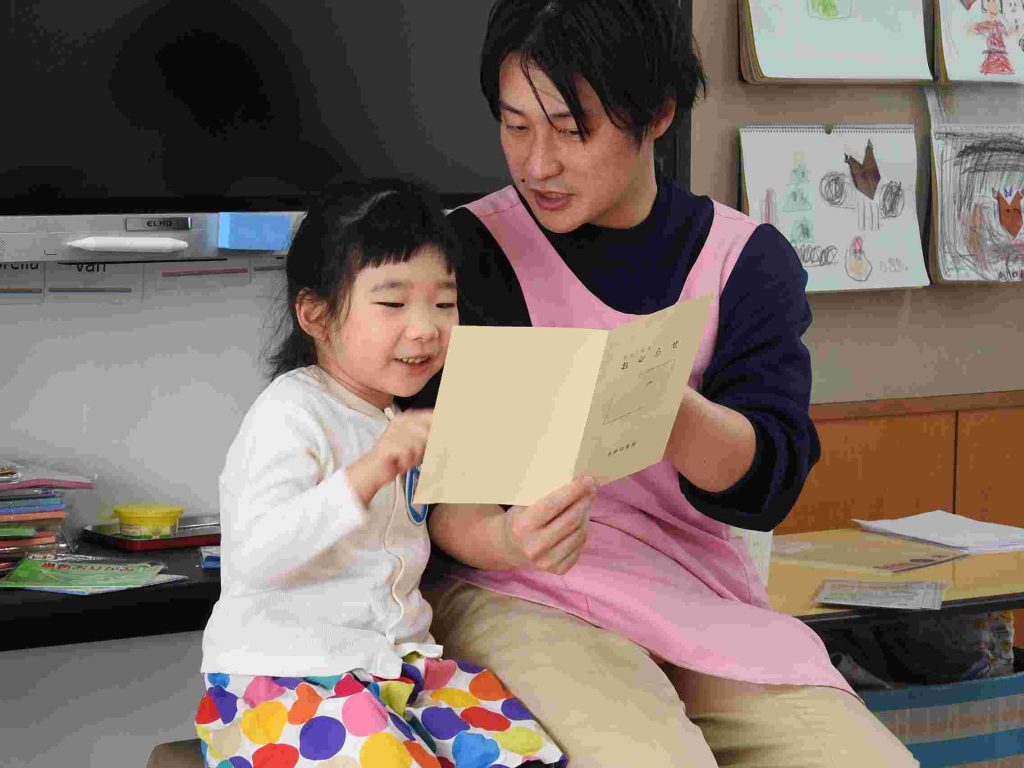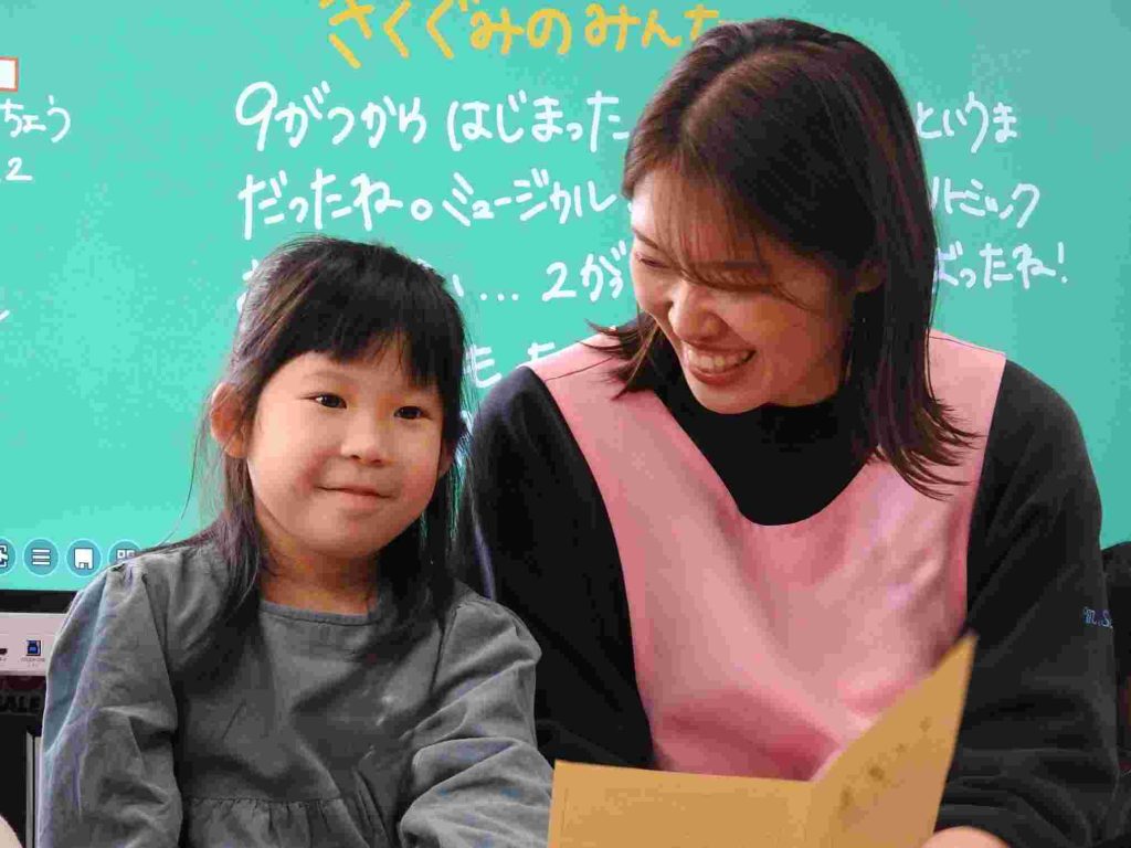 終業式の後、各クラスで2学期のおしらせ(通知表)を一人ひとりに渡しました。貞静幼稚園ではおしらせの内容を園児一人ひとりにわかりやすく伝えています。また、園児と横並びで渡すことで園児の気持ちに共感する姿勢臨んでいます。その学期にがんばったことや成長したことなどをその園児やクラスのみんなに伝えます。がんばったことや成長したことをみんなにも知らせることで自己肯定感をはぐくむこともねらいの一つです。園児と担任の先生の一番いい場面です。園児のうれしい顔、先生と目を合わせてほほ笑む様子をご覧ください。
