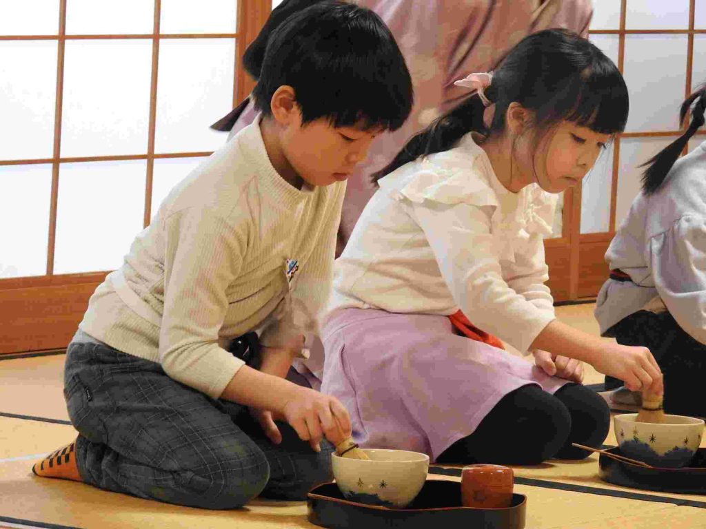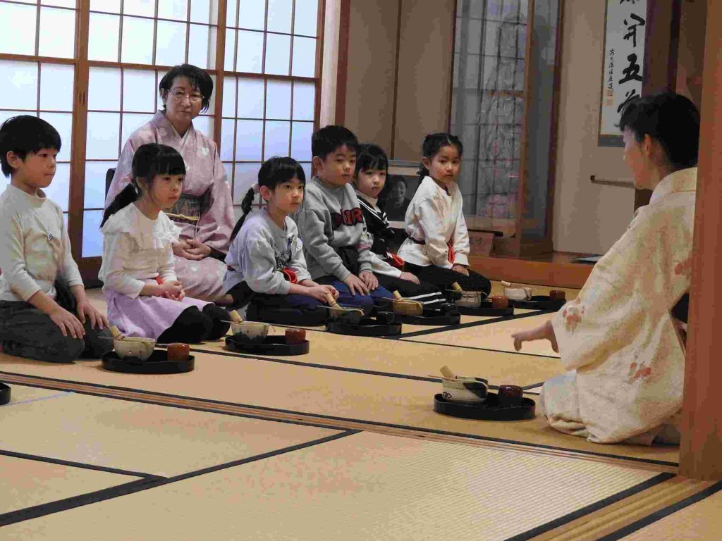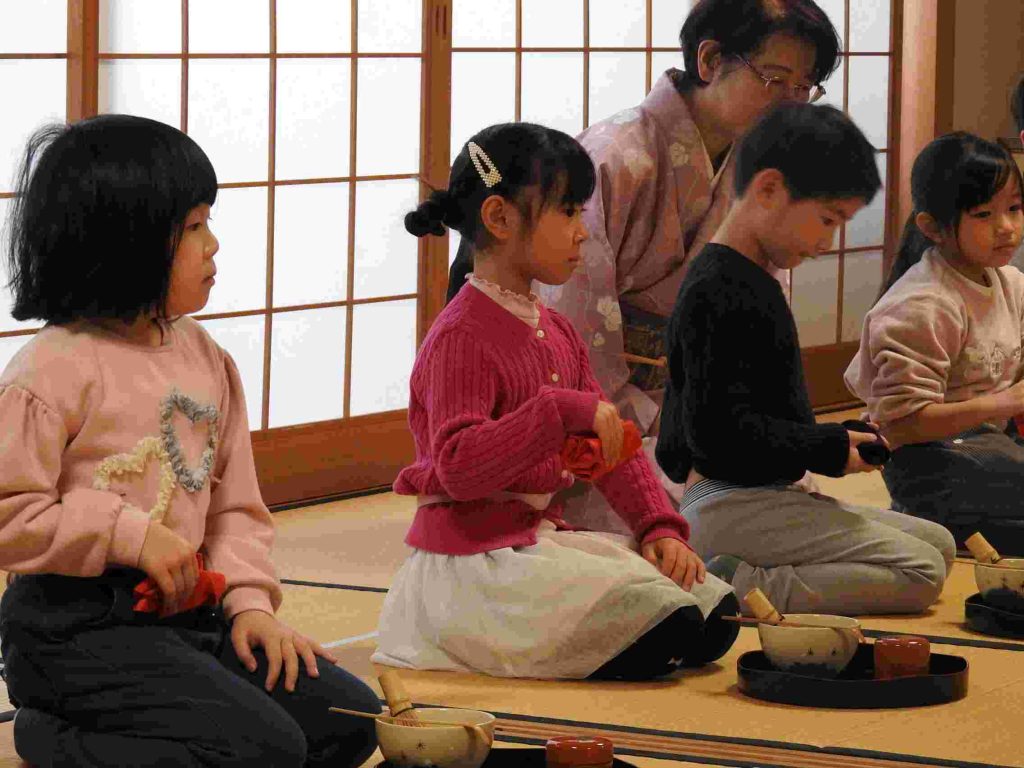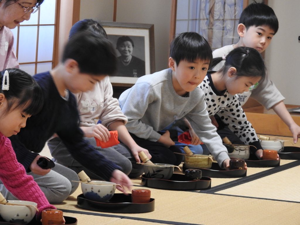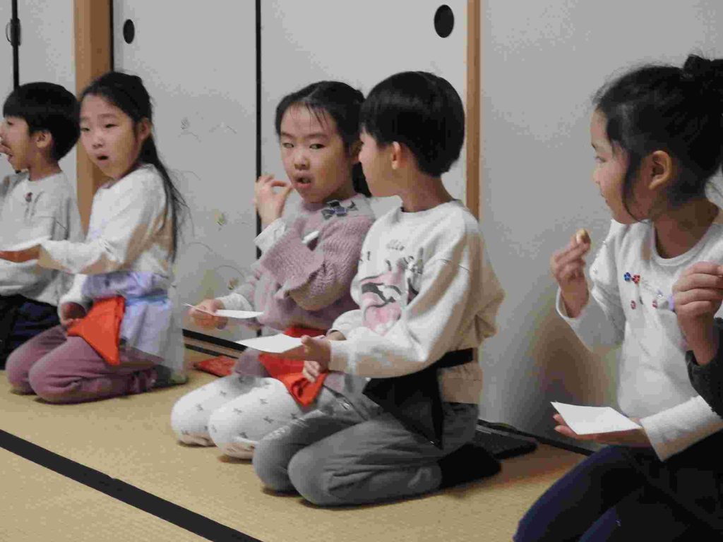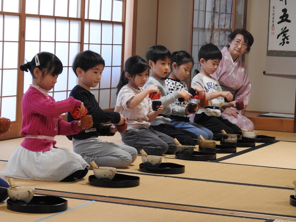 年中、年長組では3学期のお茶のお稽古が始まりました。お茶のお稽古では日常とは違い、静かな凛とした空気に包まれます。所作や作法もしっかりとできるようになってきました。今日の年長組の様子をご覧ください。