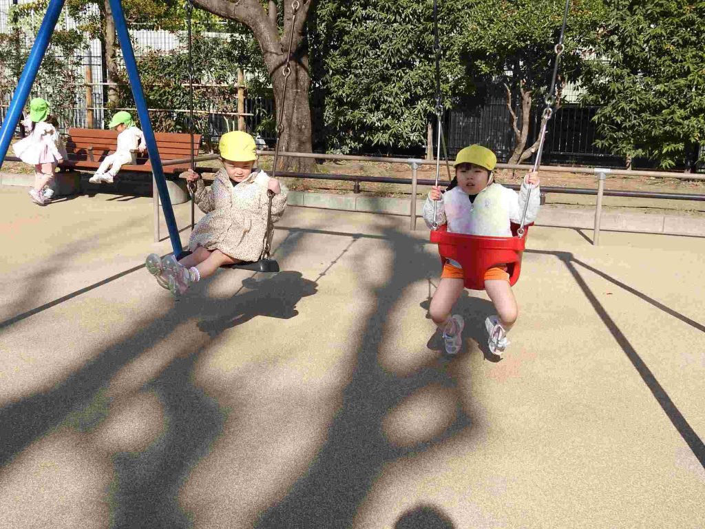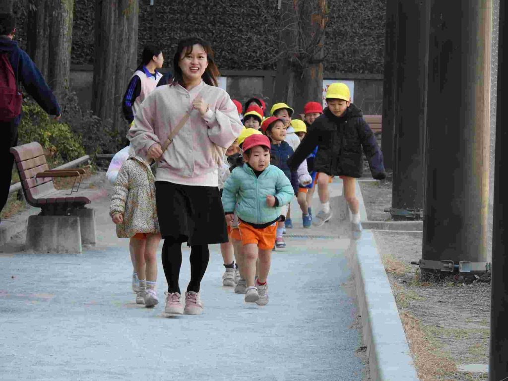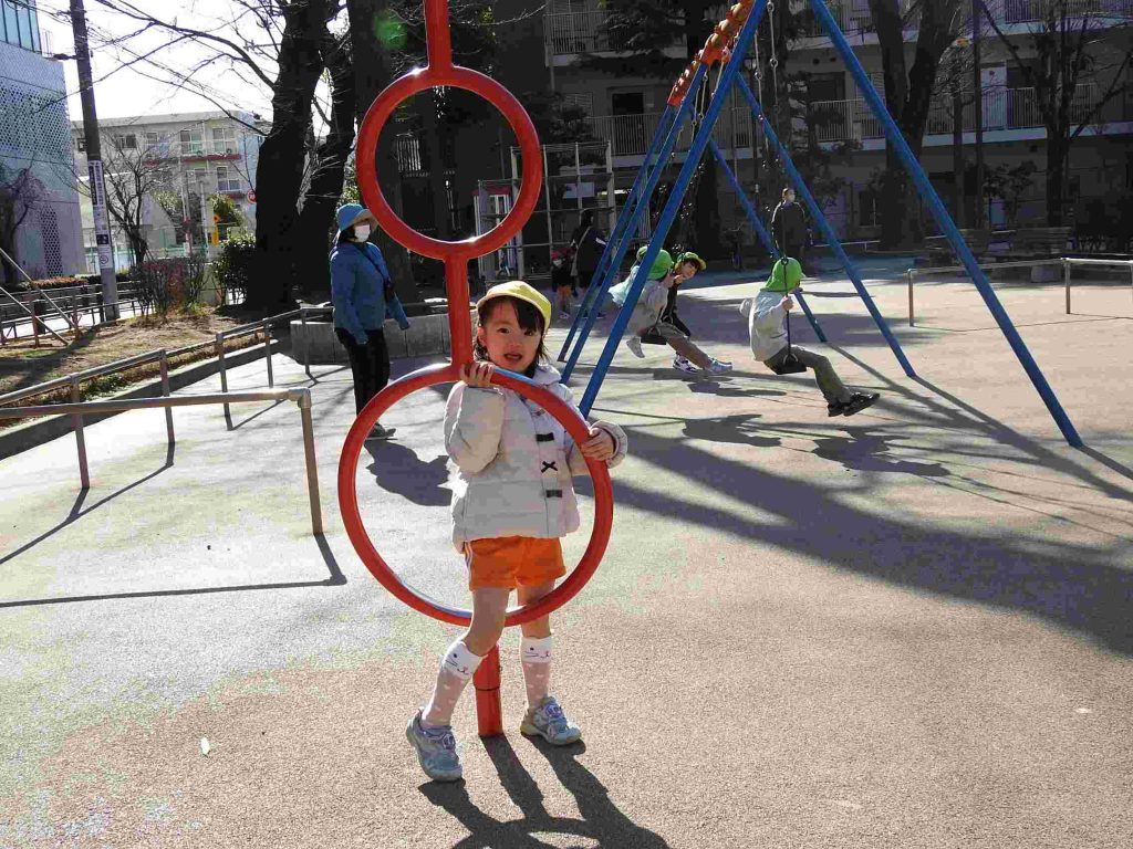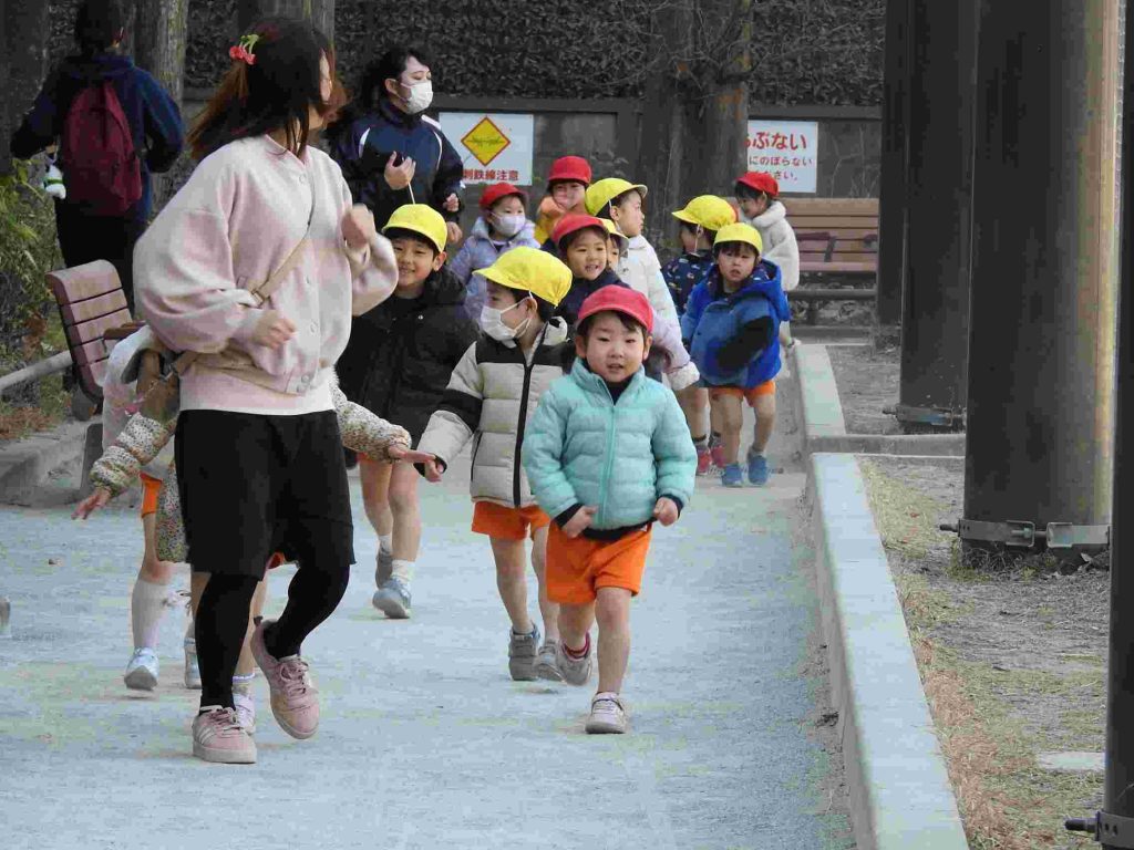 年少は初めてマラソンをしました。公園に行って、みんなで走ります。一定のペースで話しながら走れるぐらいの速さです。走る楽しさを味わいながら健康な体作りを目指します。マラソンの後は、公園で楽しく遊びました。