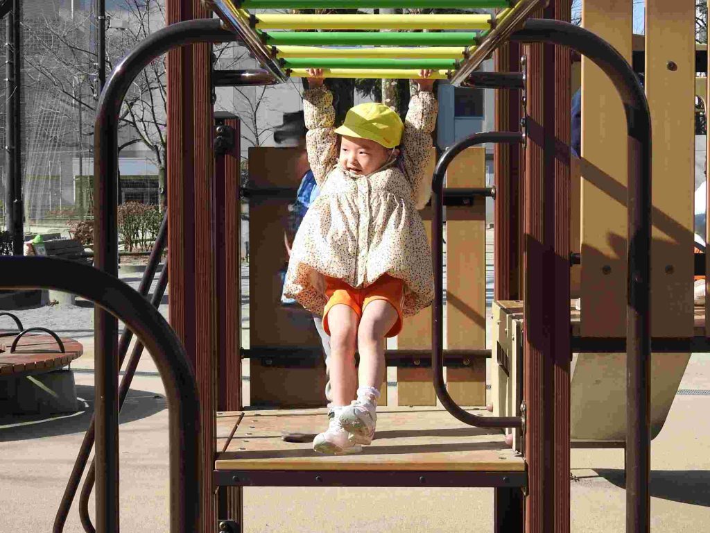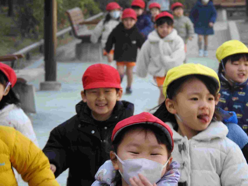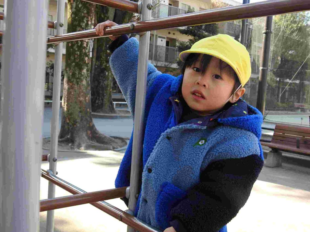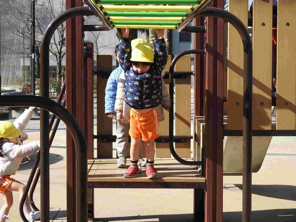 年少は初めてマラソンをしました。公園に行って、みんなで走ります。一定のペースで話しながら走れるぐらいの速さです。走る楽しさを味わいながら健康な体作りを目指します。マラソンの後は、公園で楽しく遊びました。