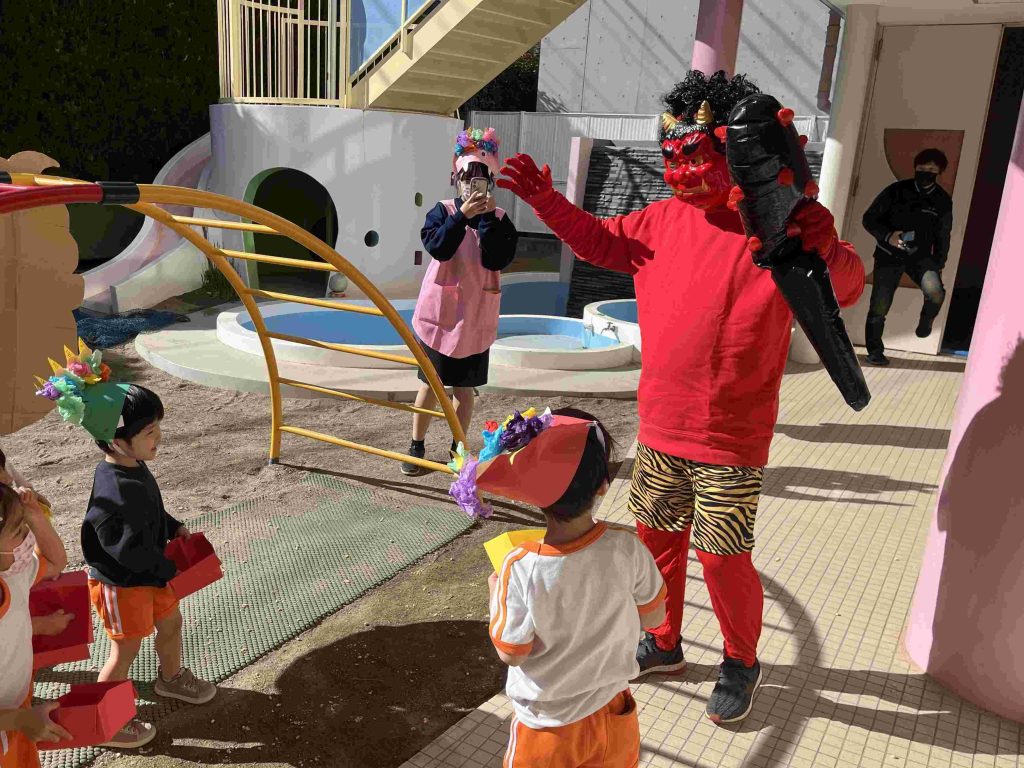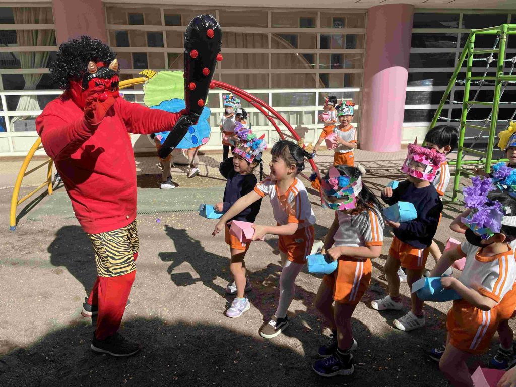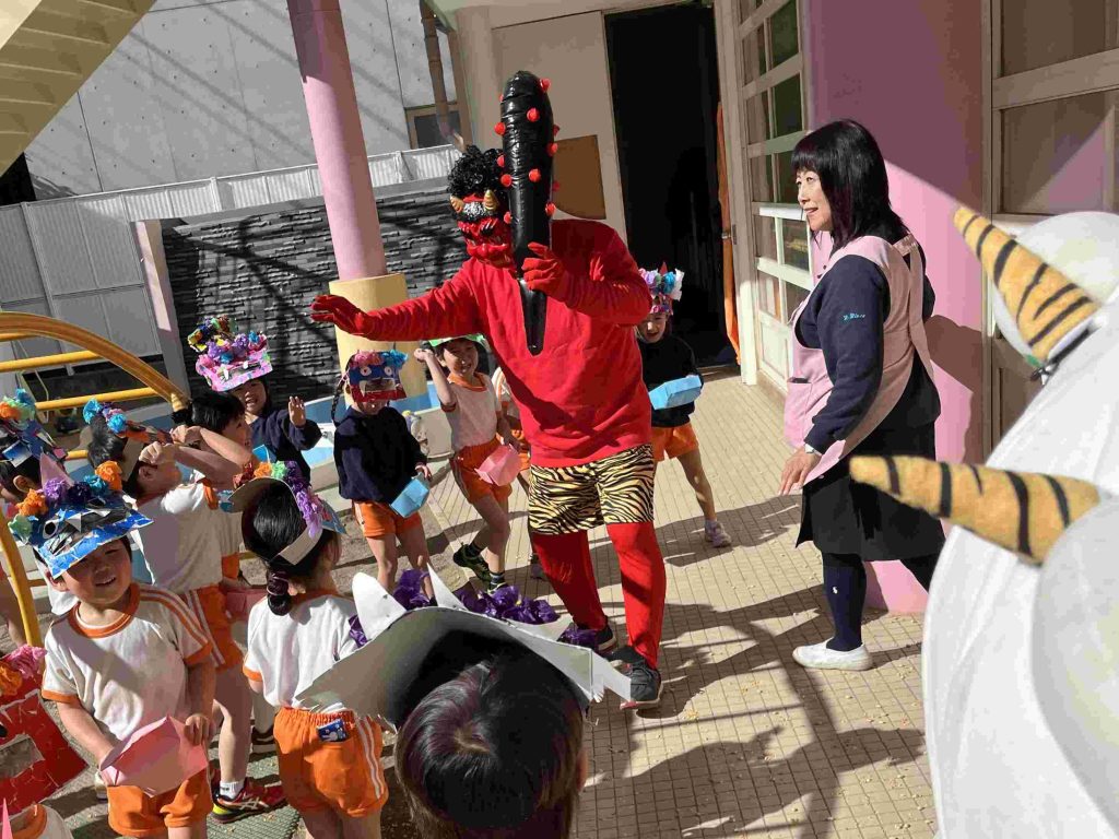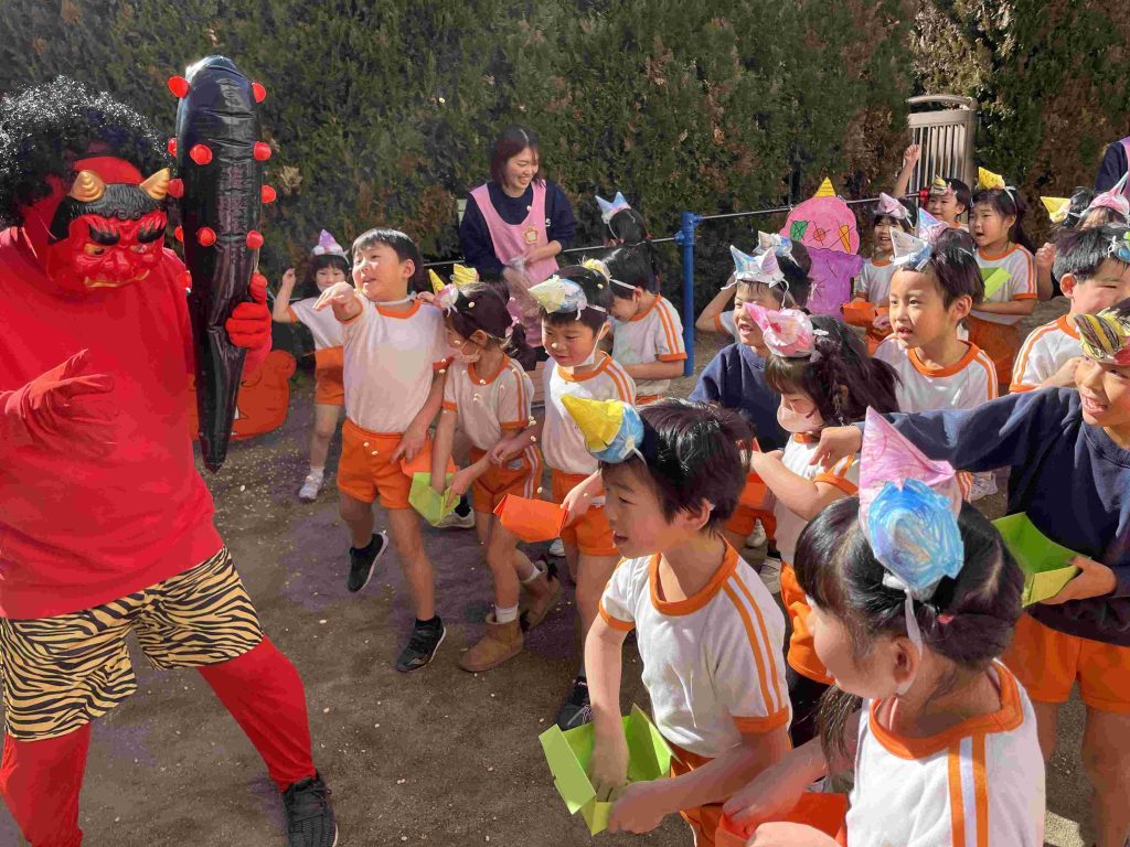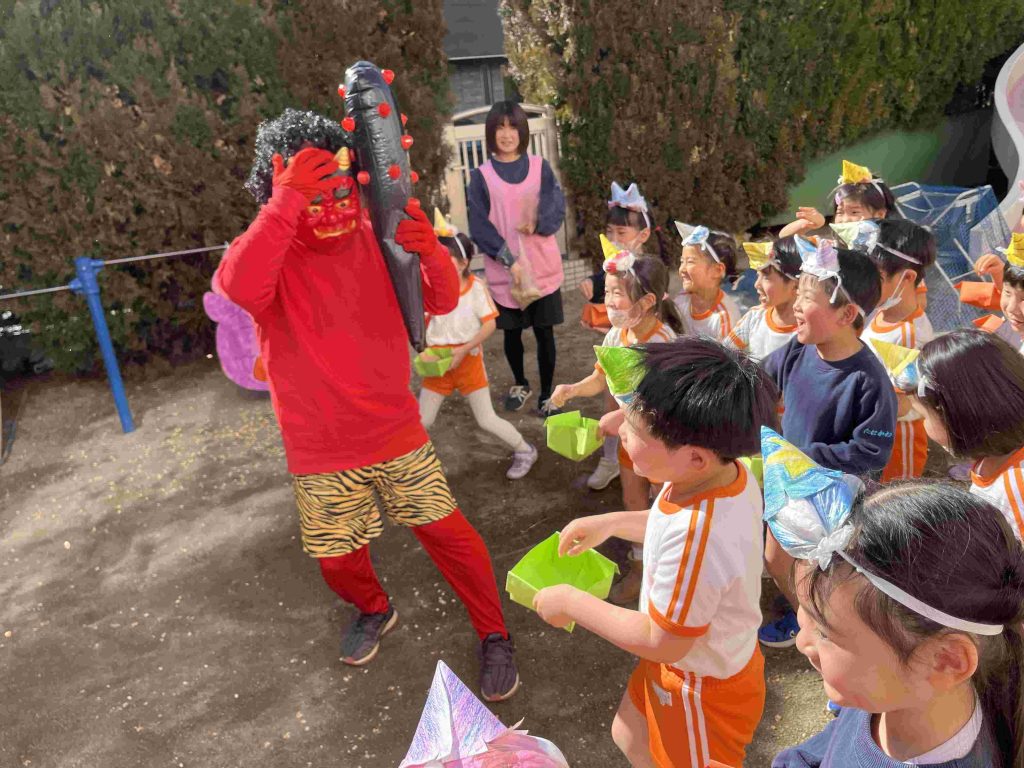 今日は節分。今年も貞静幼稚園に赤鬼がやってきました。今日の豆まきには「ファミッペ」という助っ人が来てくれました。「鬼は外、福は内」ファミッペには優しく、赤鬼には力強く豆が投げられていました。貞静幼稚園の子どもにはきっと福がやってきます。今日の給食は、「鬼弁当」でした。子どもの心がよくわかっている調理員さんです。