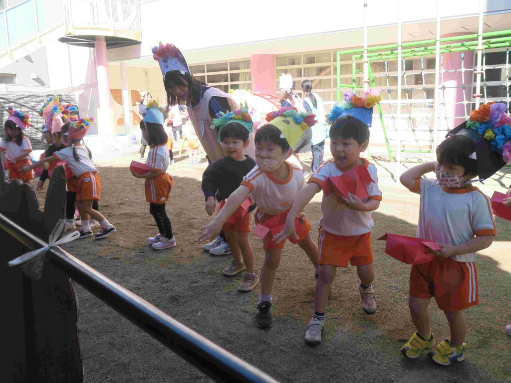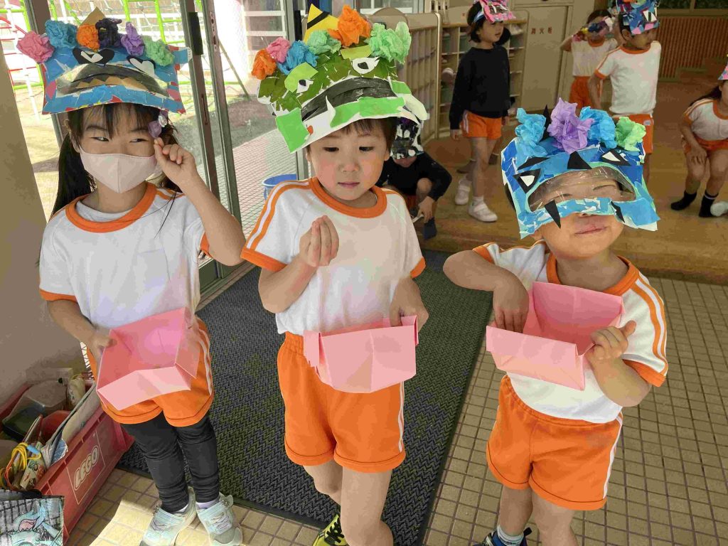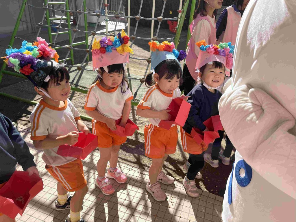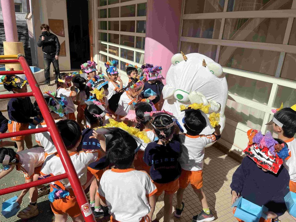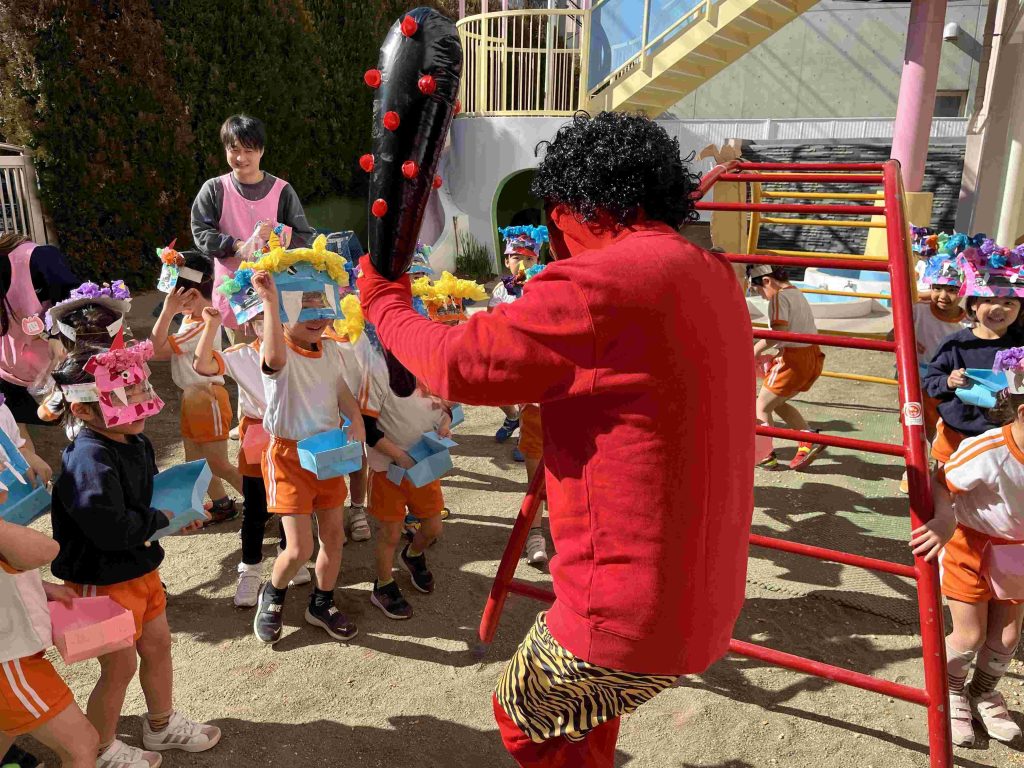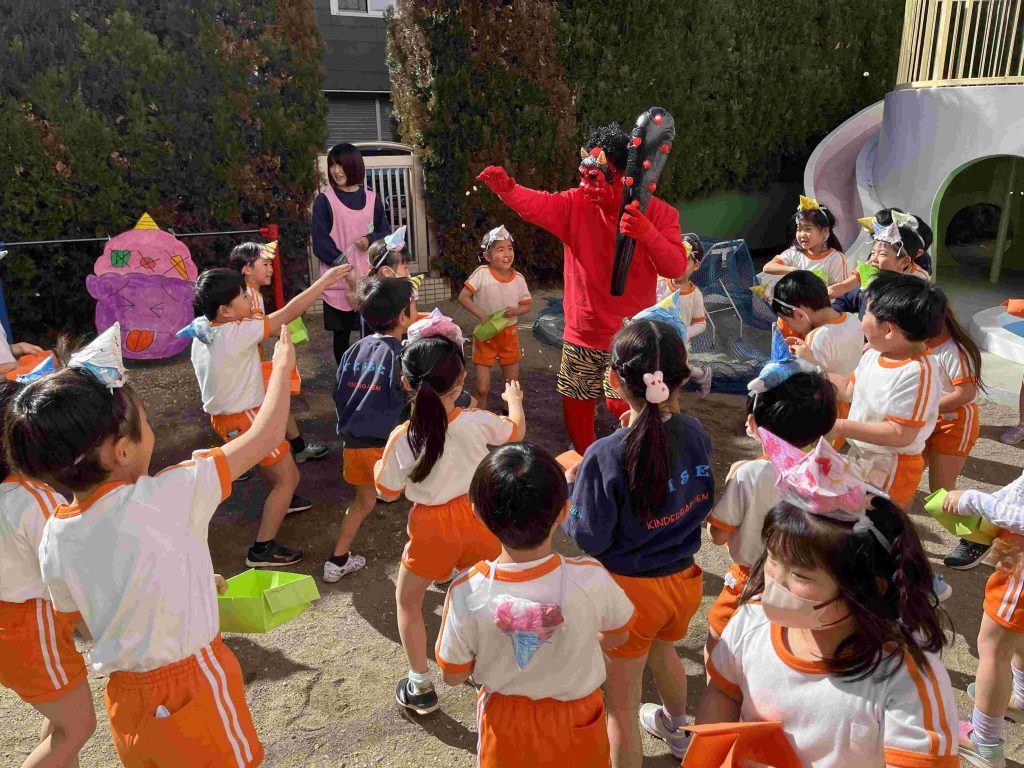 今日は節分。今年も貞静幼稚園に赤鬼がやってきました。今日の豆まきには「ファミッペ」という助っ人が来てくれました。「鬼は外、福は内」ファミッペには優しく、赤鬼には力強く豆が投げられていました。貞静幼稚園の子どもにはきっと福がやってきます。今日の給食は、「鬼弁当」でした。子どもの心がよくわかっている調理員さんです。