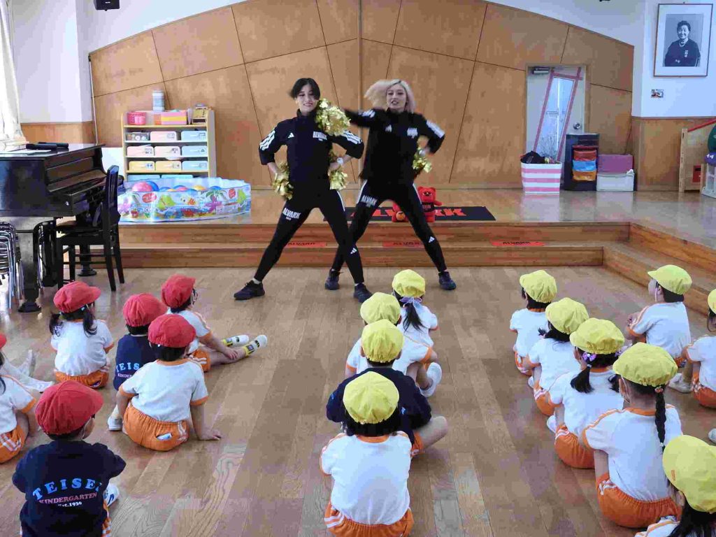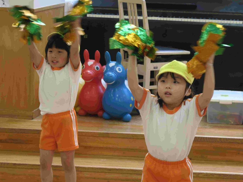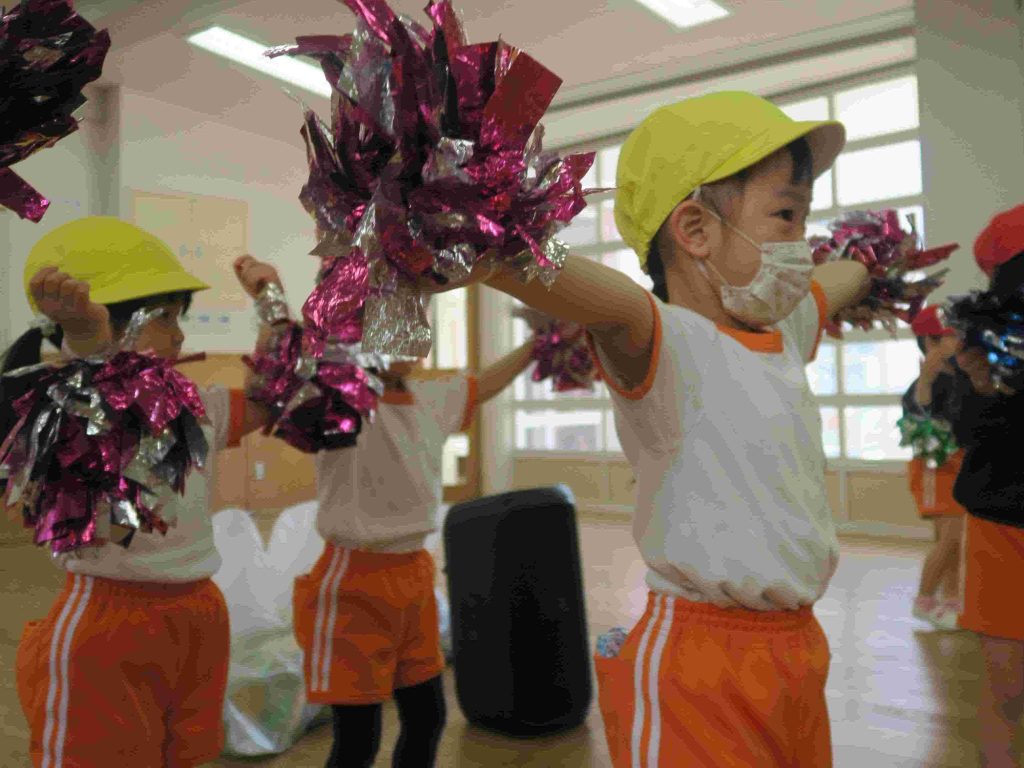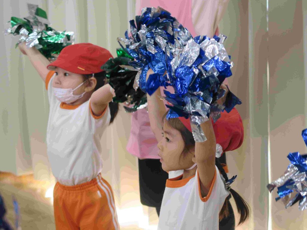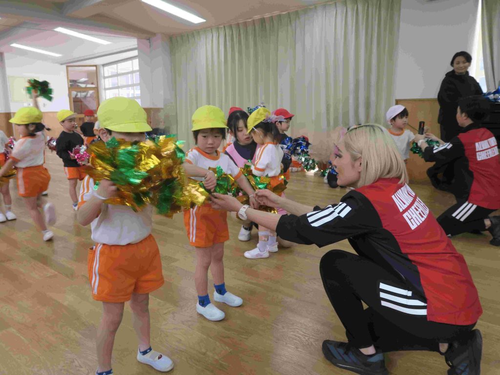 チアの動きの基本を教えていただき、曲に合わせてダンスの練習をしました。ポンポンも持って、全員がチアリーダーになりました。チアリーダーの方とお別れの時には「もっとやりたかった」という声が聞こえてきました。