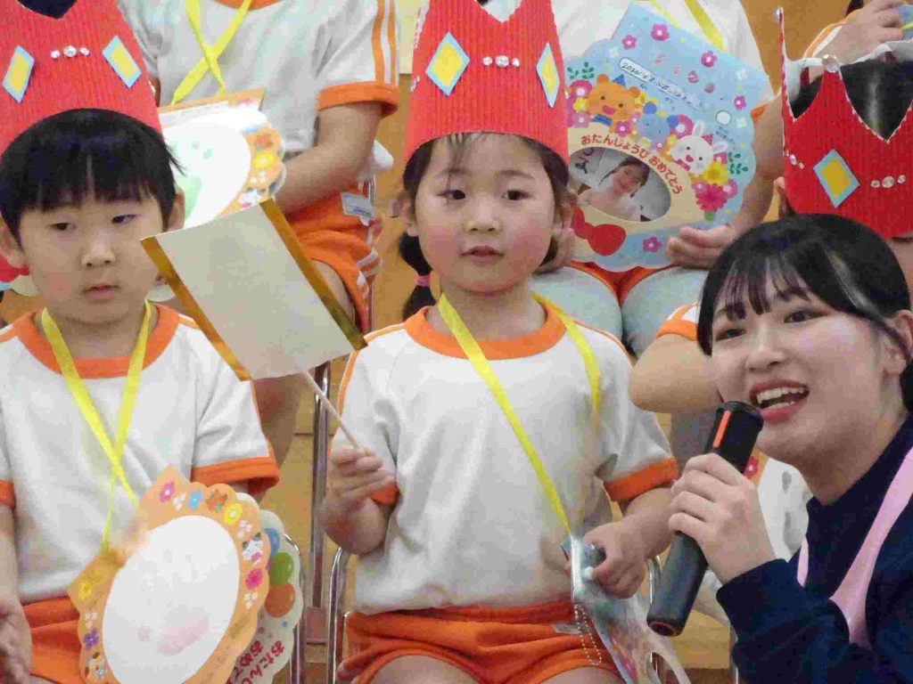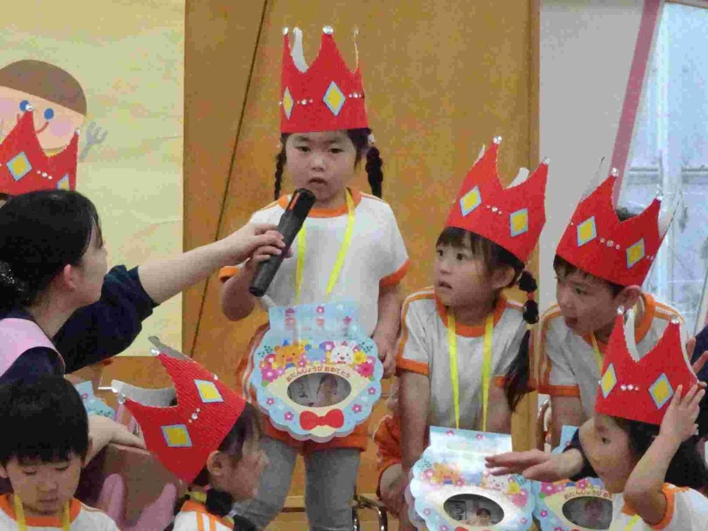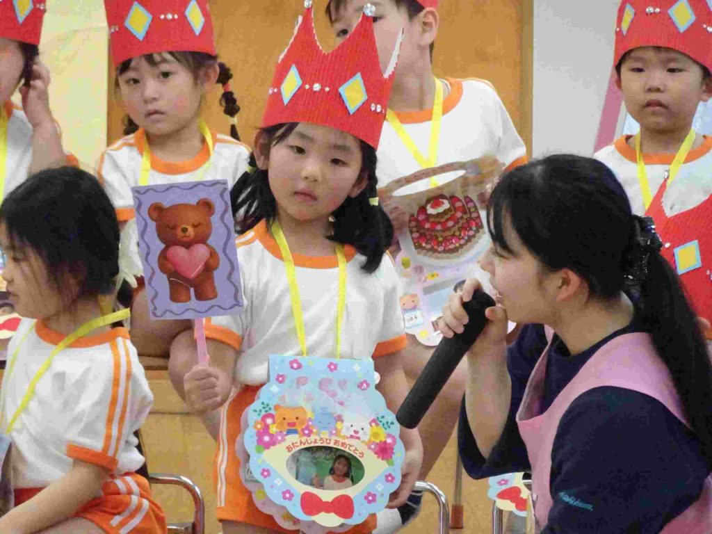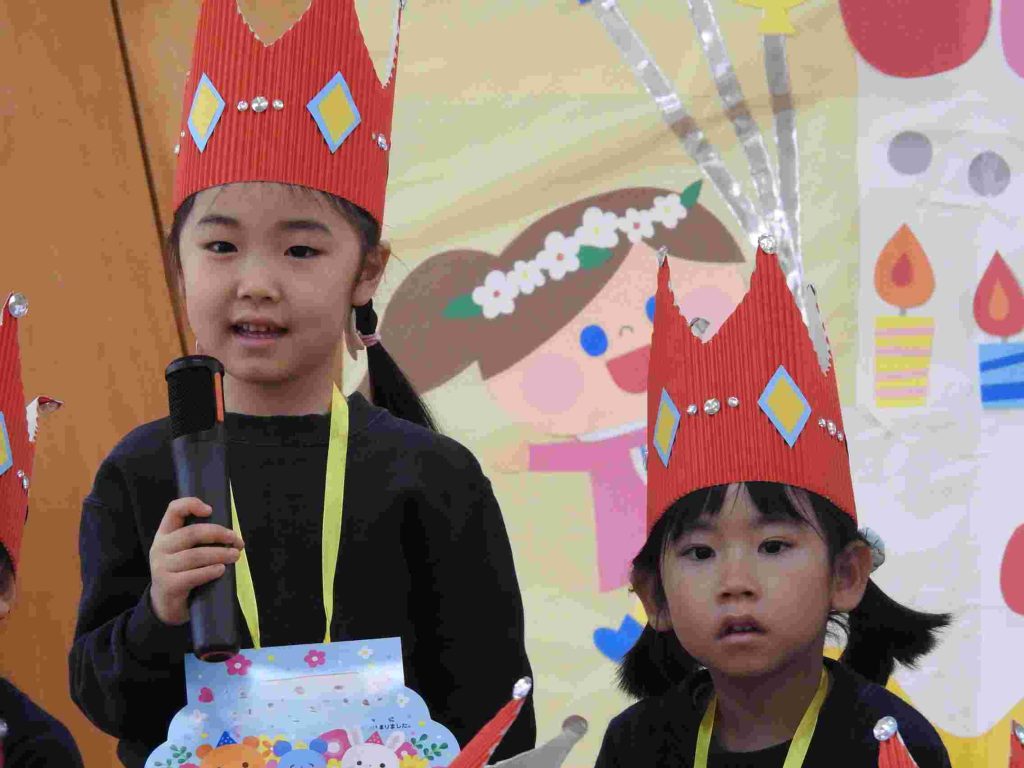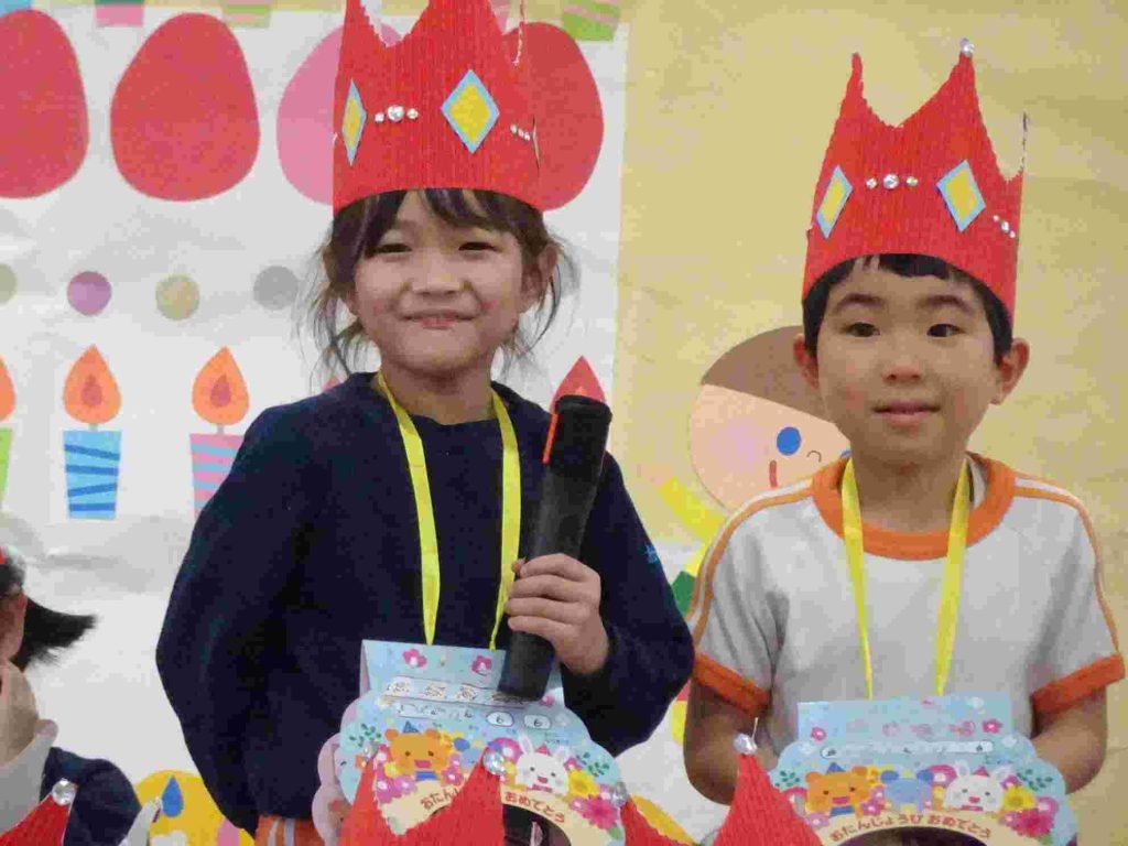 今日は1月、2月のお誕生日会でした。1月はインフルエンザ拡大防止のため、お誕生日会は行いませんでした。今日は、インフルエンザでお休みの園児はいませんでした。1月2月生まれの園児は質問に一生懸命答えました。ちなみに園長の質問は「好きなプリンセスは誰ですか?」でした。