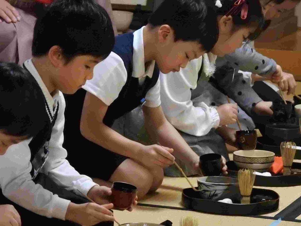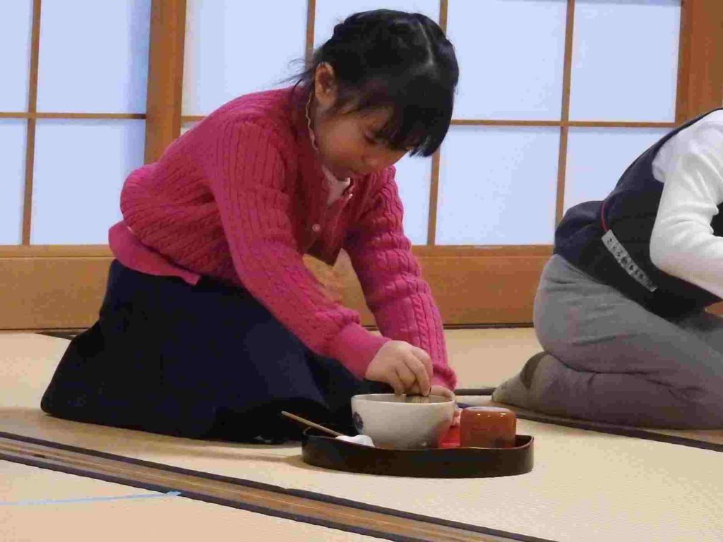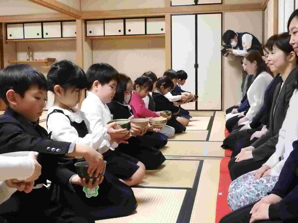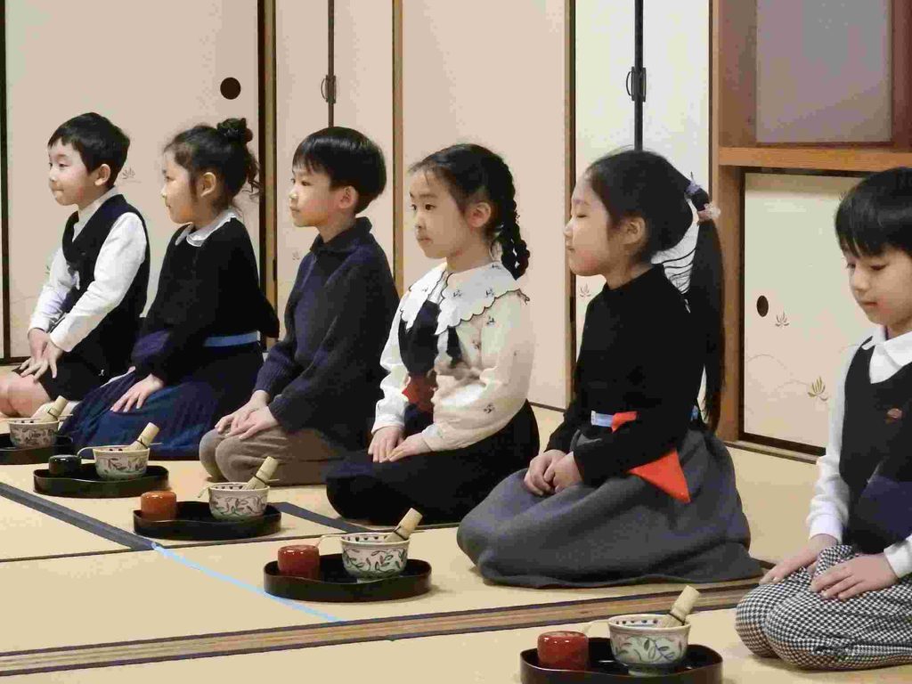 保護者の皆さまをお招きしてお茶会を催しました。年長組の園児は作法も所作も立派です。凛とした空気の中でこれまで学んできたことを見ていただきました。「今まで飲んだお茶の中で一番美味しかった」と話してくださるお母様もいらっしゃいました。将来、国際社会に羽ばたいていく子どもたちがこの時期に日本文化に触れていくことは非常に大切であると思います。