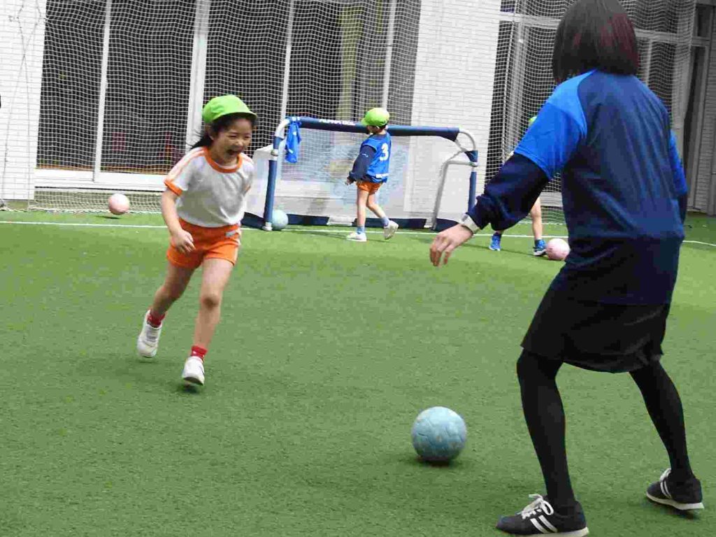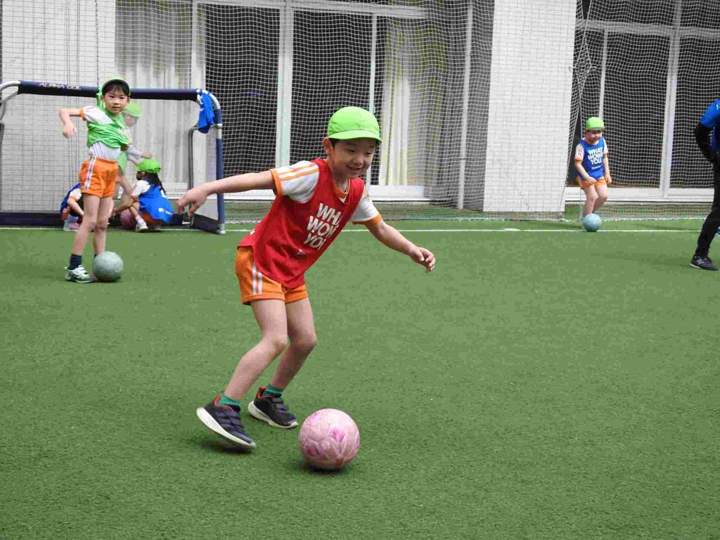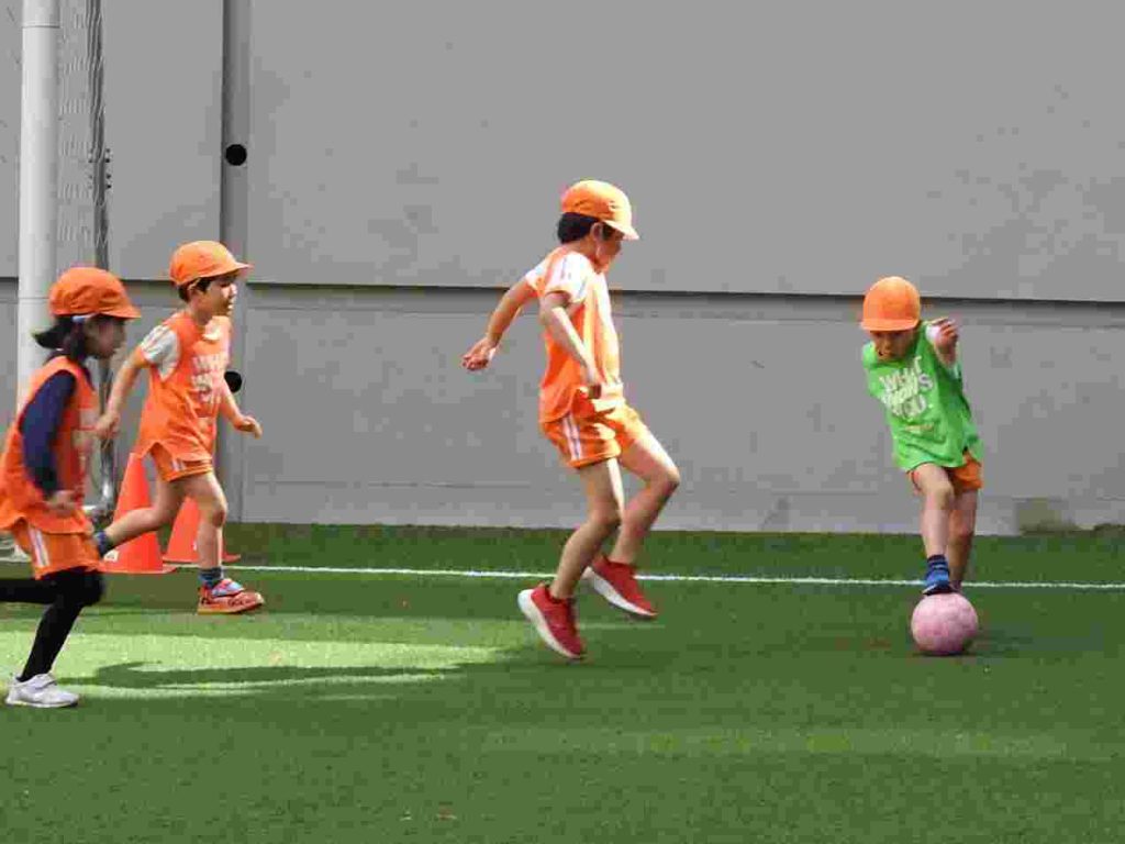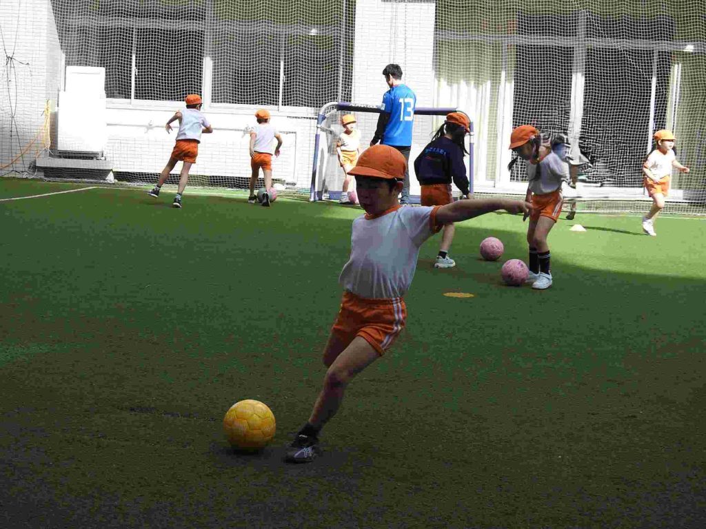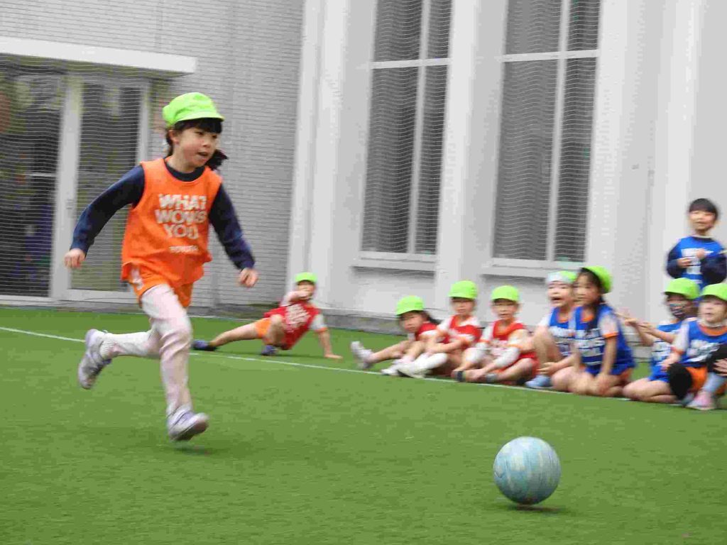 サッカー上手になりました。ボールを蹴る、止める、走るということがしっかりとできていました。さらに、前向きな気持ちをもって全力で取り組むこともできています。一人ひとりがサッカーを楽しんでいます。今日は東京都サッカー協会の方に加え、東京ユナイテッドからも指導の方がいらっしゃいました。園児が楽しくサッカーに取り組む工夫をしてくださいました。ありがとうございます。