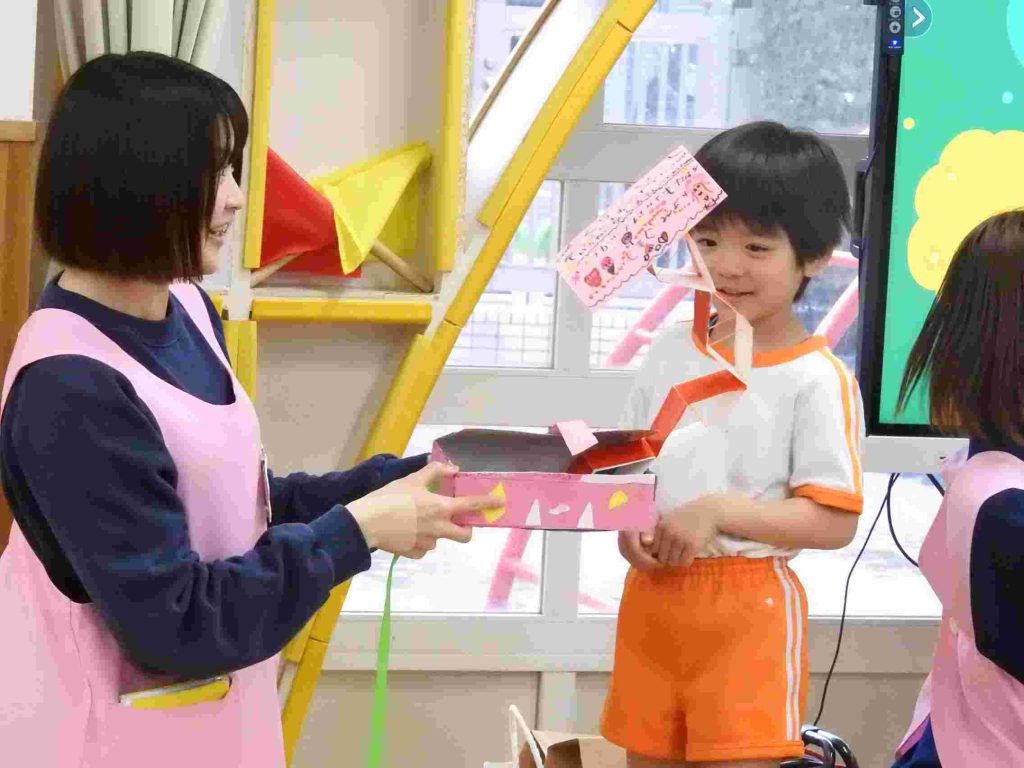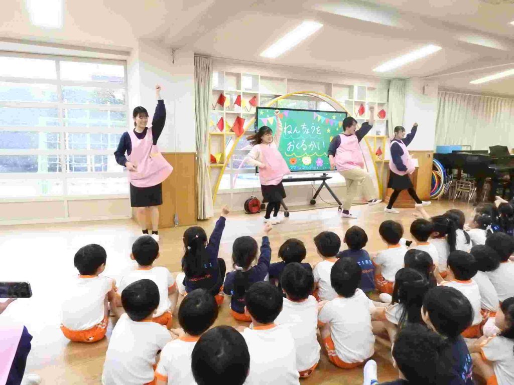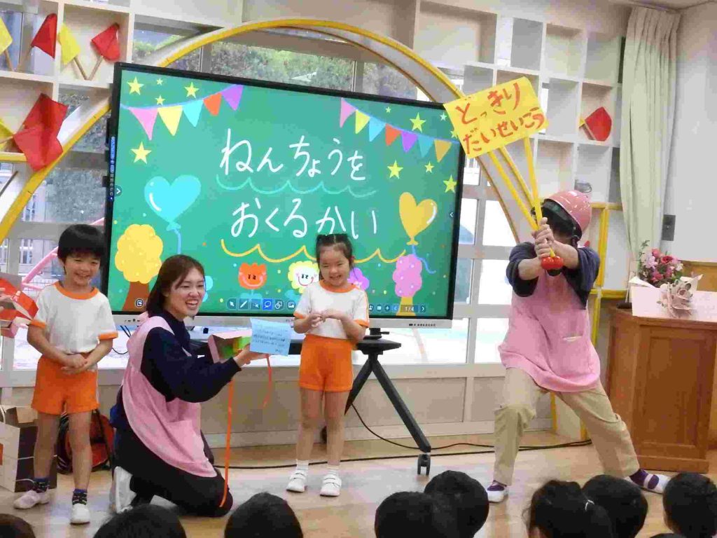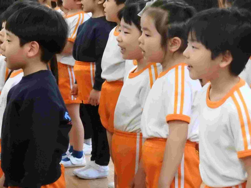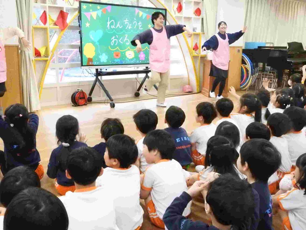 今日は「年長を送る会」を行いました。年少、年中組からは年長組一人ひとりに手作りのプレゼントが贈られました。年長を代表して担任の先生に手渡されたのですが、そこで「ドッキリ」がありました。さすが年中組、趣向を凝らしました。先生方はダンスを披露して盛り上げました。年長組は幼稚園への記念品として手作りの「クラス表示」を渡してくれました。この後、表示を入れ替えます。最後には卒園式で式歌として歌う「旅立ちの日に」を年少・年中に贈りました。とてもきれいな歌声で、聴く人の心に響く歌でした。卒園式では参列者全員で歌います。参列なさる方は練習してきてください。お願いします。