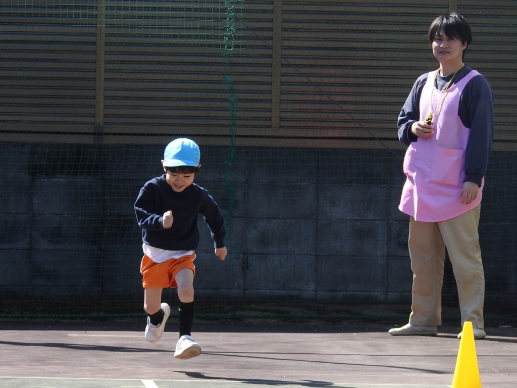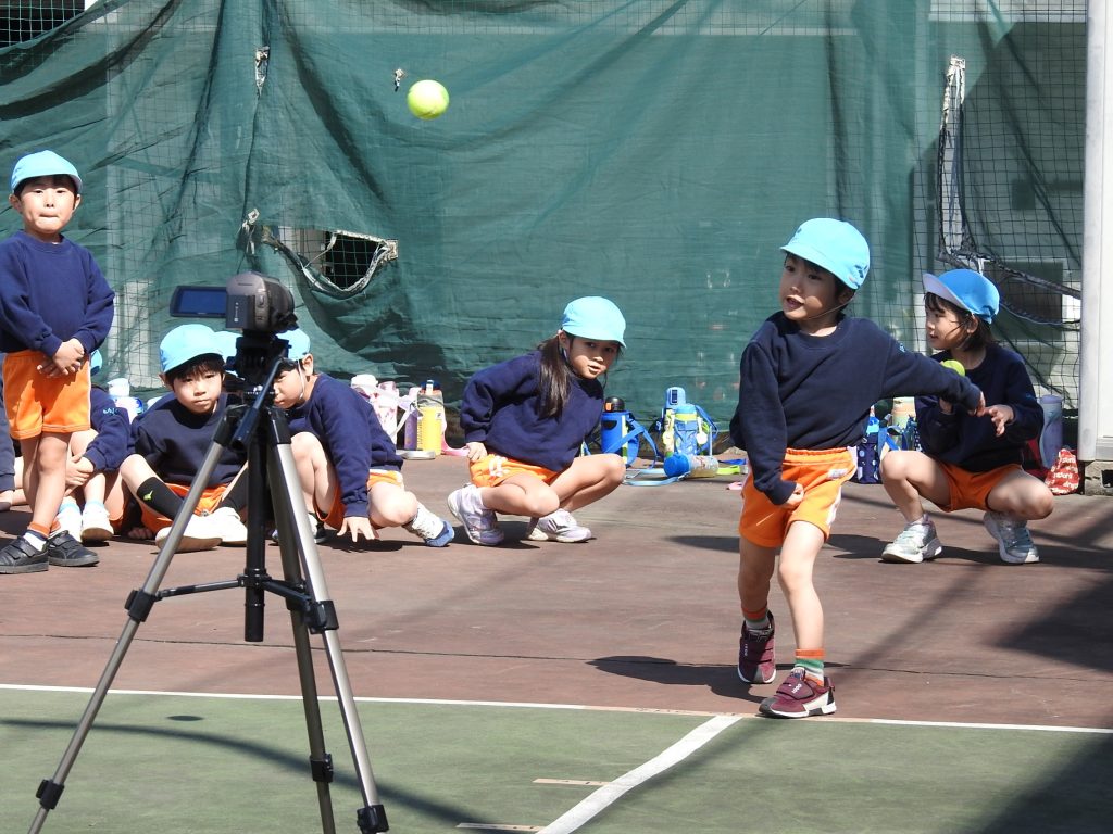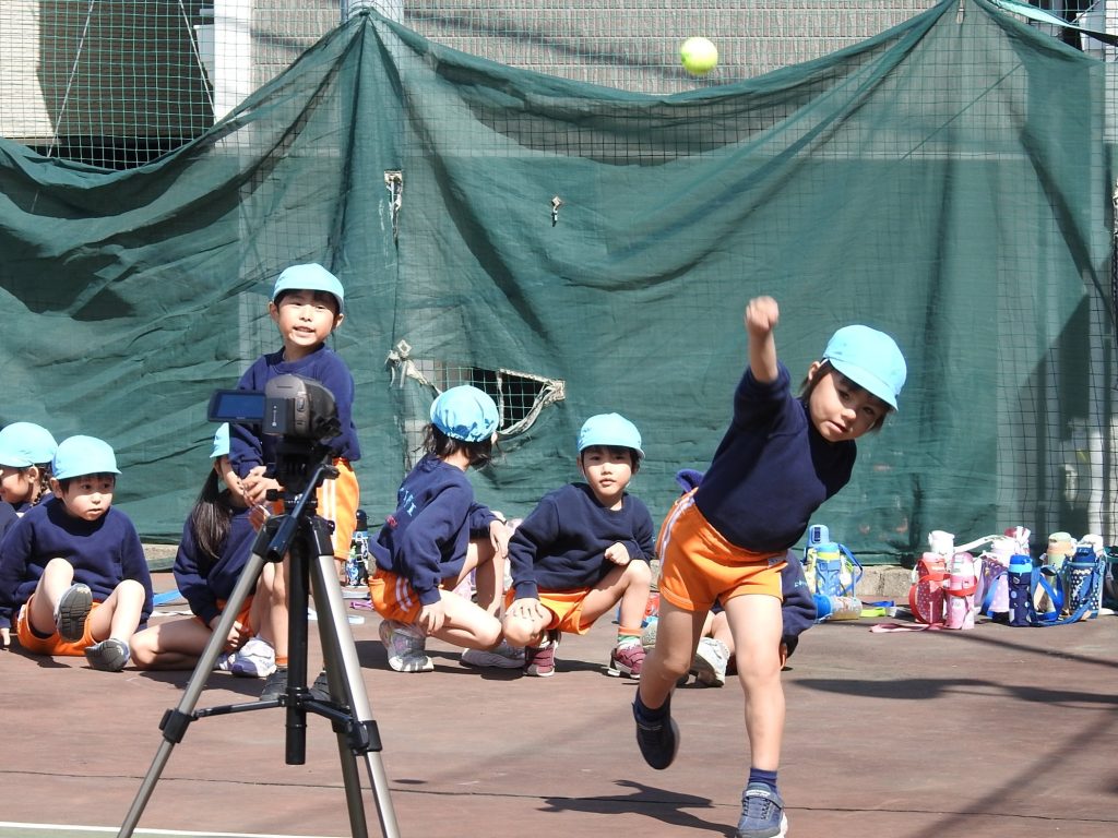 今日は小日向にある学園のテニスコートまで歩いていってボール投げと25m走をしました。ボール投げはテニスボールを使いました。25m走ではフォームがしっかりとして地面を力強く蹴れるようになりました。前回とった記録より伸びた園児が多くいます。結果はそれぞれの保護者にフィードバックされます。