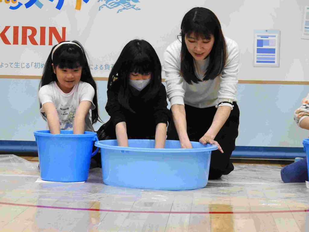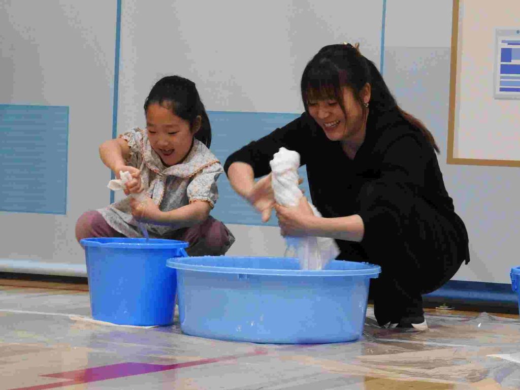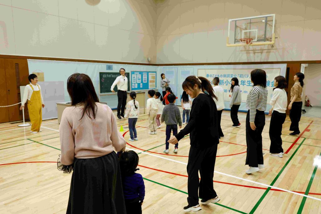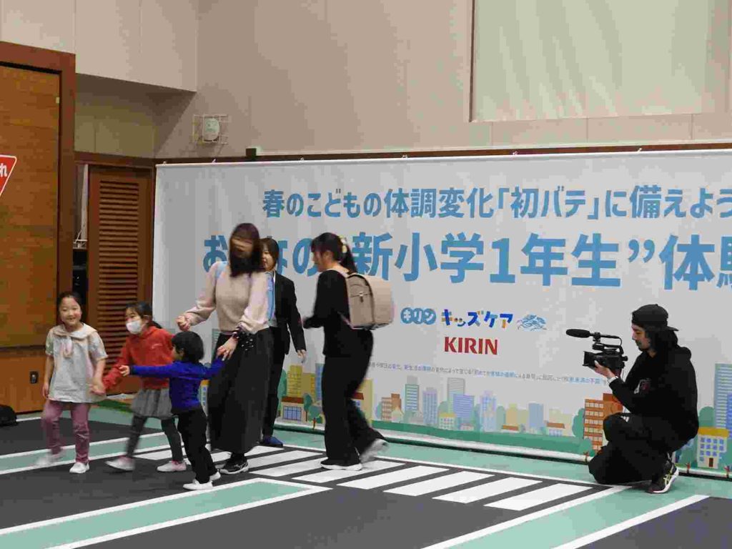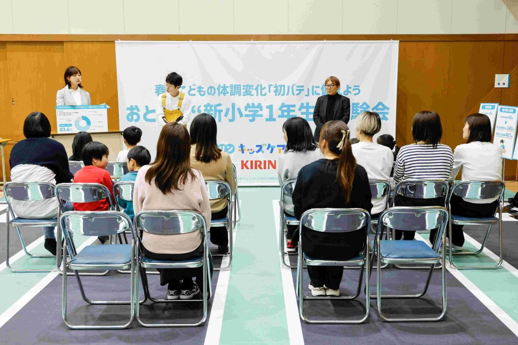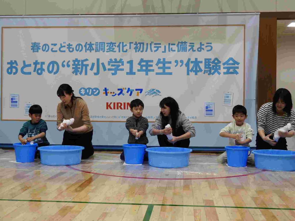 キリンホールディングスが主催する「春の子どもの体調変化『初バテ』に備えよう おとなの“新小学1年生”体験会」が併設の貞静学園短期大学で行われました。新小学校1年生がこのあと経験することになる「重いランドセル」「雑巾がけ」「雑巾しぼり」を大人仕様にして保護者の皆さまに体験していただくという内容でした。先日卒園をした年長組の園児と保護者が参加しました。MCの木下ゆーきさんが軽妙なトークで会場を盛り上げてくださいます。一般社団法人日本臨床統合医療学会 理事長 川嶋 朗 先生は「早寝早起きをして朝ご飯を食べること」「しっかり睡眠をとること」「適度な運動をすること」で、免疫力がついて、病気に対して強い体になっていくというお話をしてくださいました。