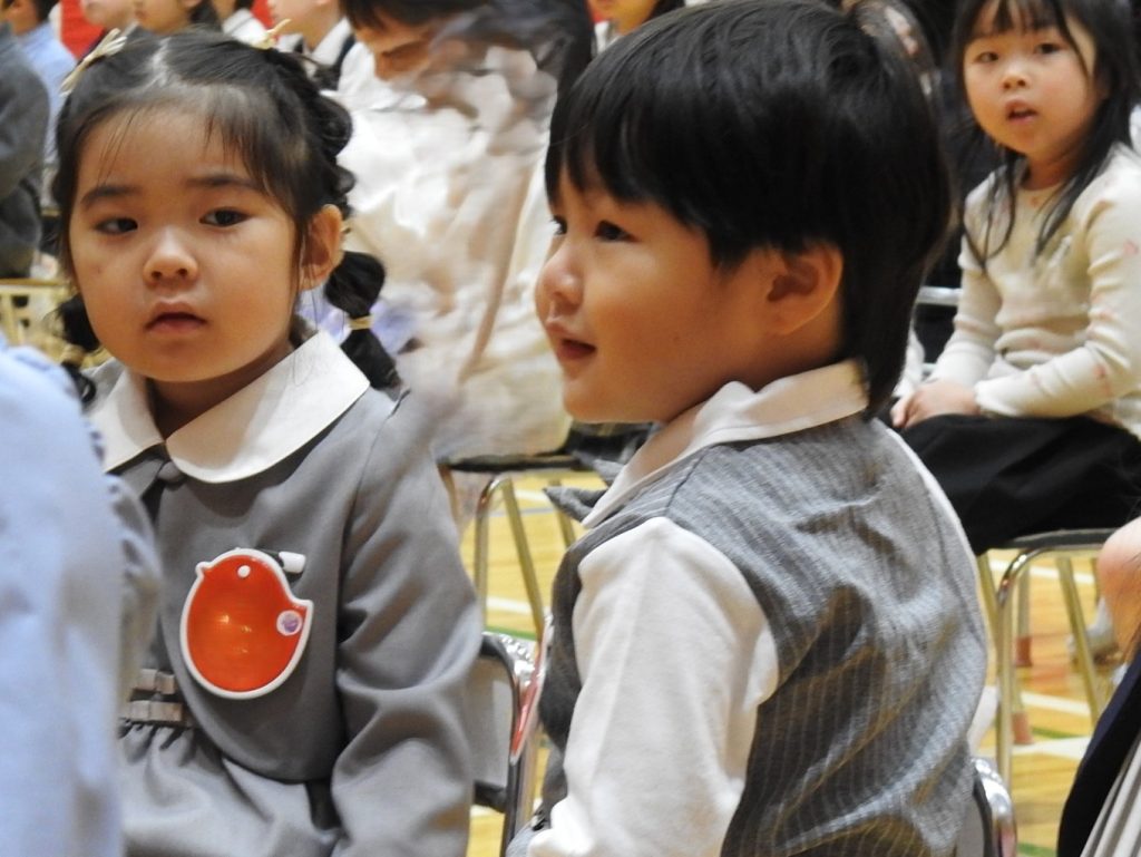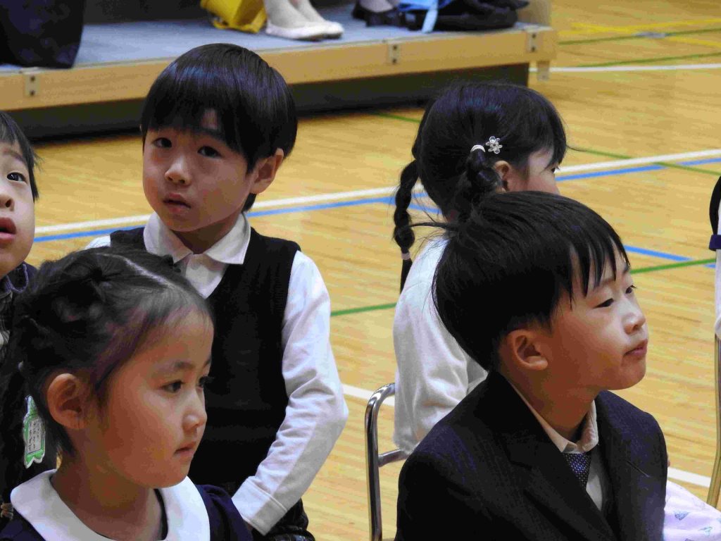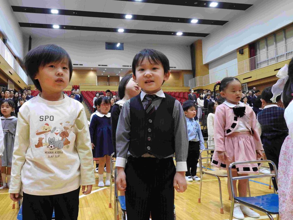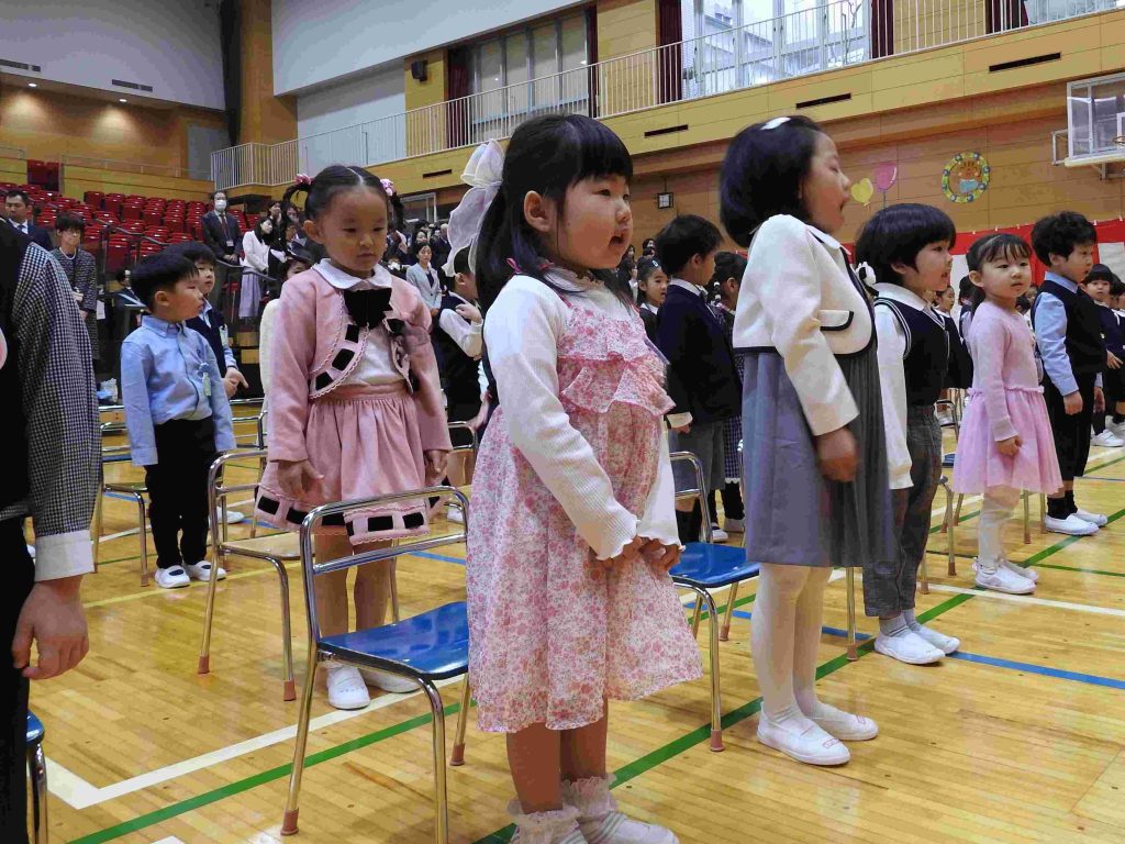 本日、2026年度入園式、第1学期始業式を中学校高等学校体育館で行いました。今日、貞静幼稚園の園児になった新入園児は元気に手をあげて「はいっ」と返事をする子も、呼名されるとはにかみながらも一生懸命返事をする姿がとてもかわいらしかったです。進級した園児は、3月の時より少し大人っぽくなったように見えます。「みんな。楽しい毎日が待ってますよ!」