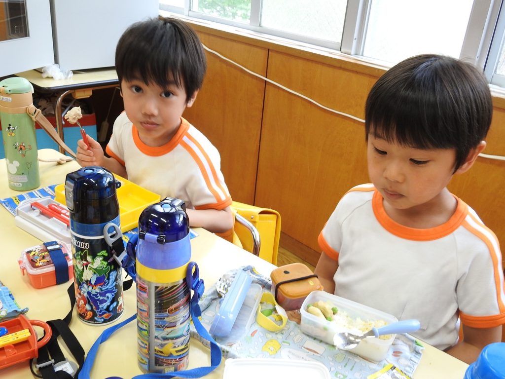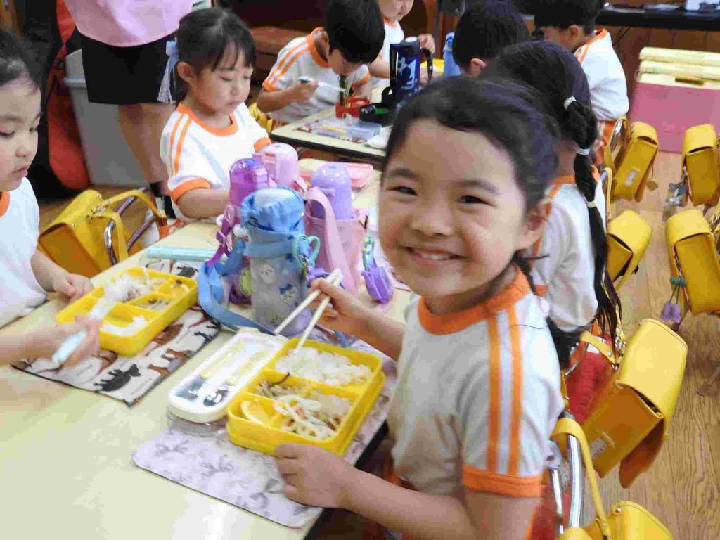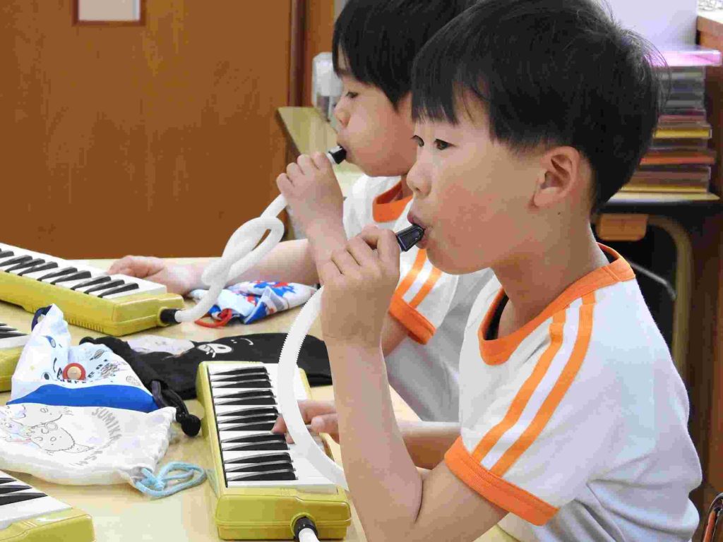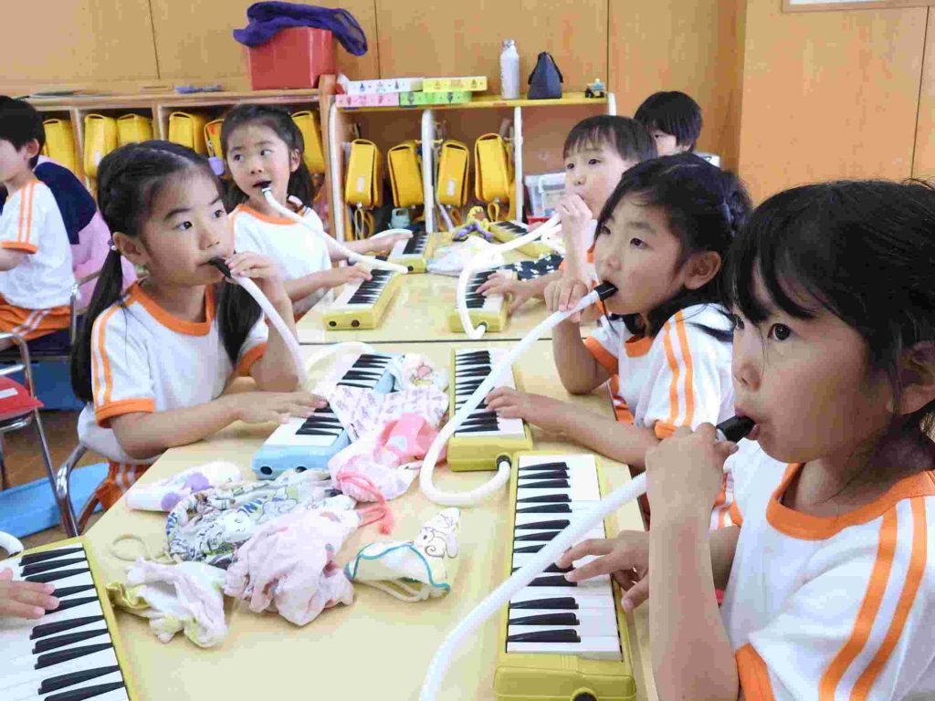 年長組では今日から鍵盤ハーモニカ、の練習が始まりました。年長になって初めてだったので、運指よりもリズム感をもって楽しくできる工夫をしました。園児も音を出す楽しさを感じたようです。お昼ご飯も楽しそうです。学期の初めでも落ち着いて楽しく食事ができています。