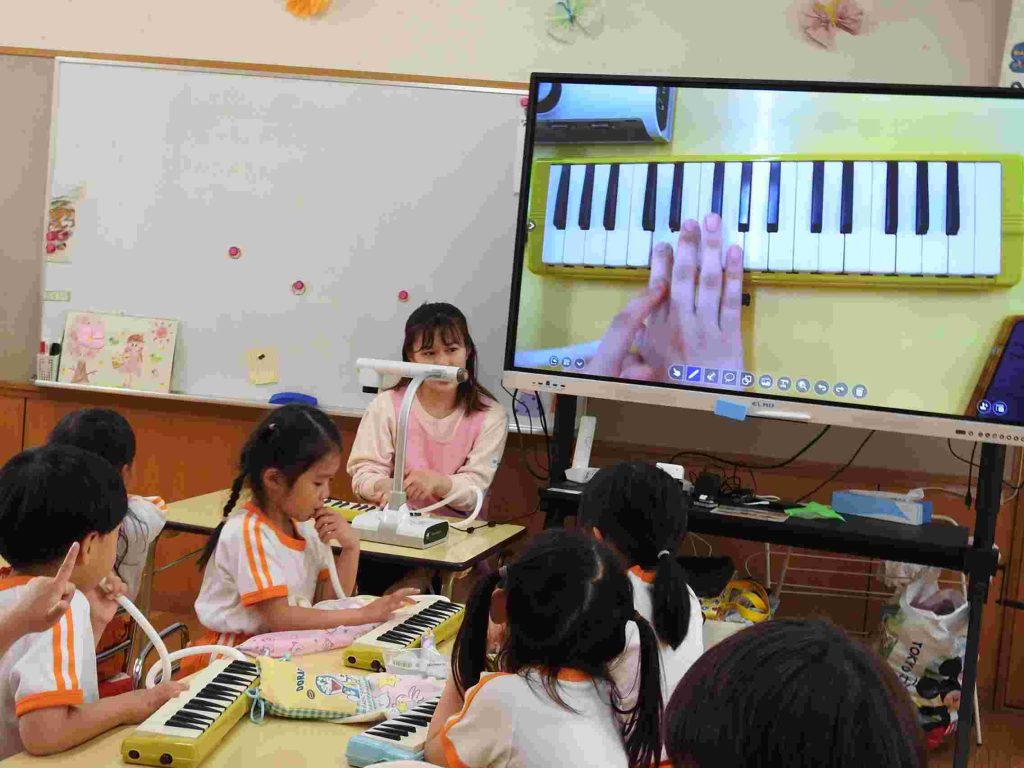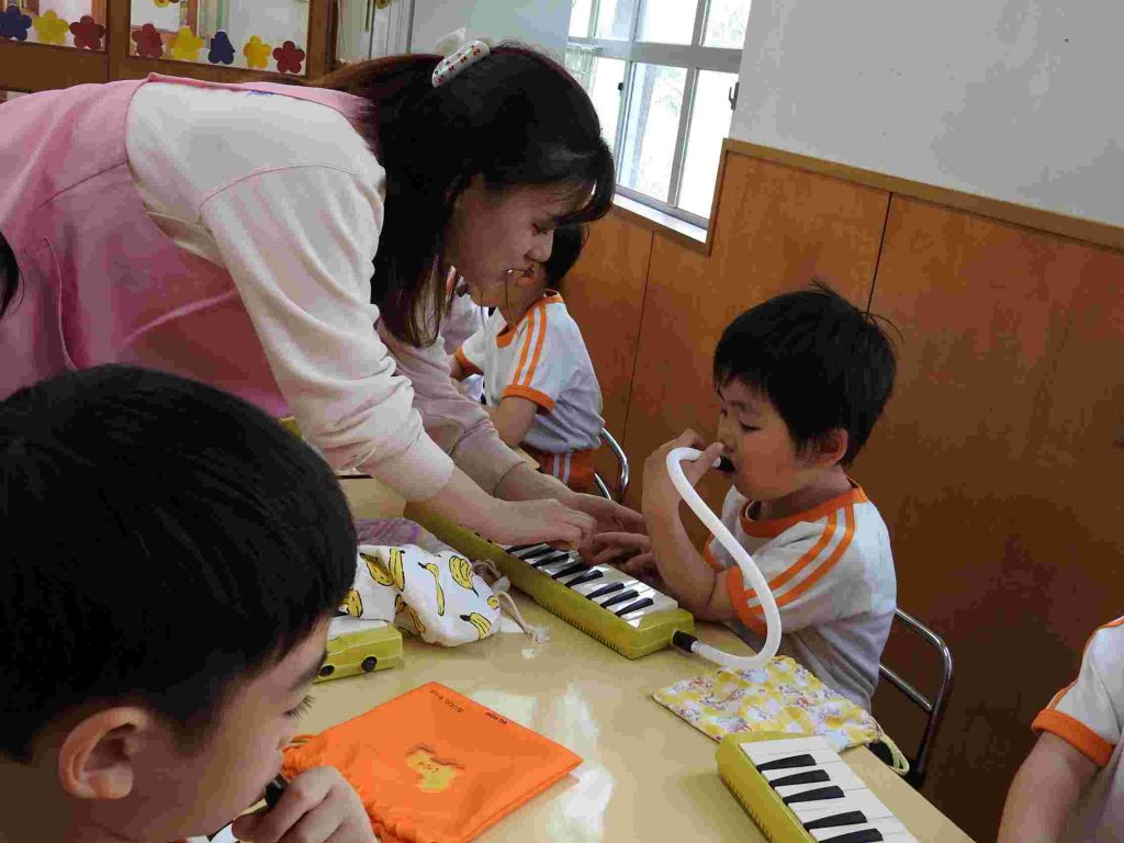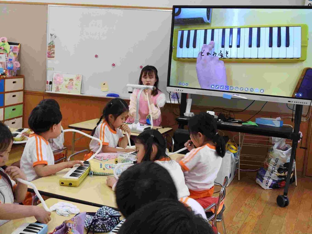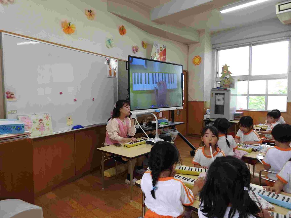 年長組では今日から鍵盤ハーモニカ、の練習が始まりました。年長になって初めてだったので、運指よりもリズム感をもって楽しくできる工夫をしました。園児も音を出す楽しさを感じたようです。お昼ご飯も楽しそうです。学期の初めでも落ち着いて楽しく食事ができています。