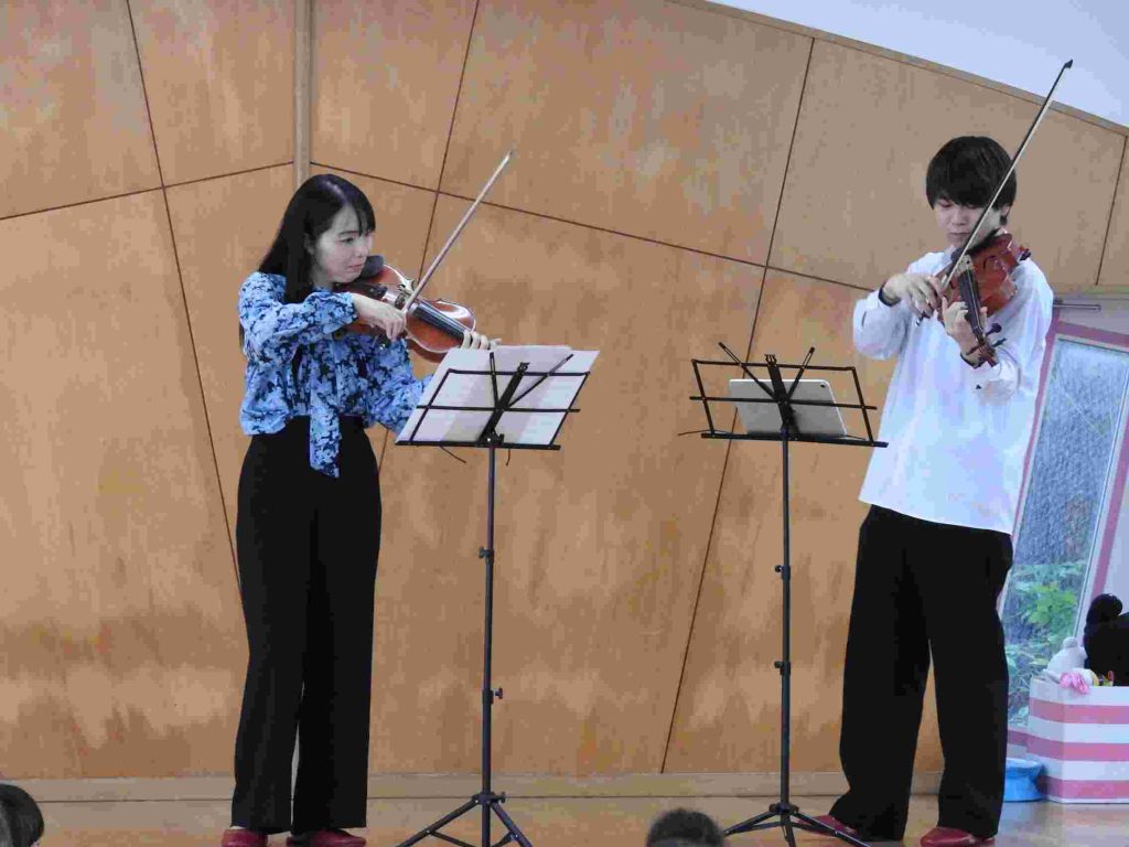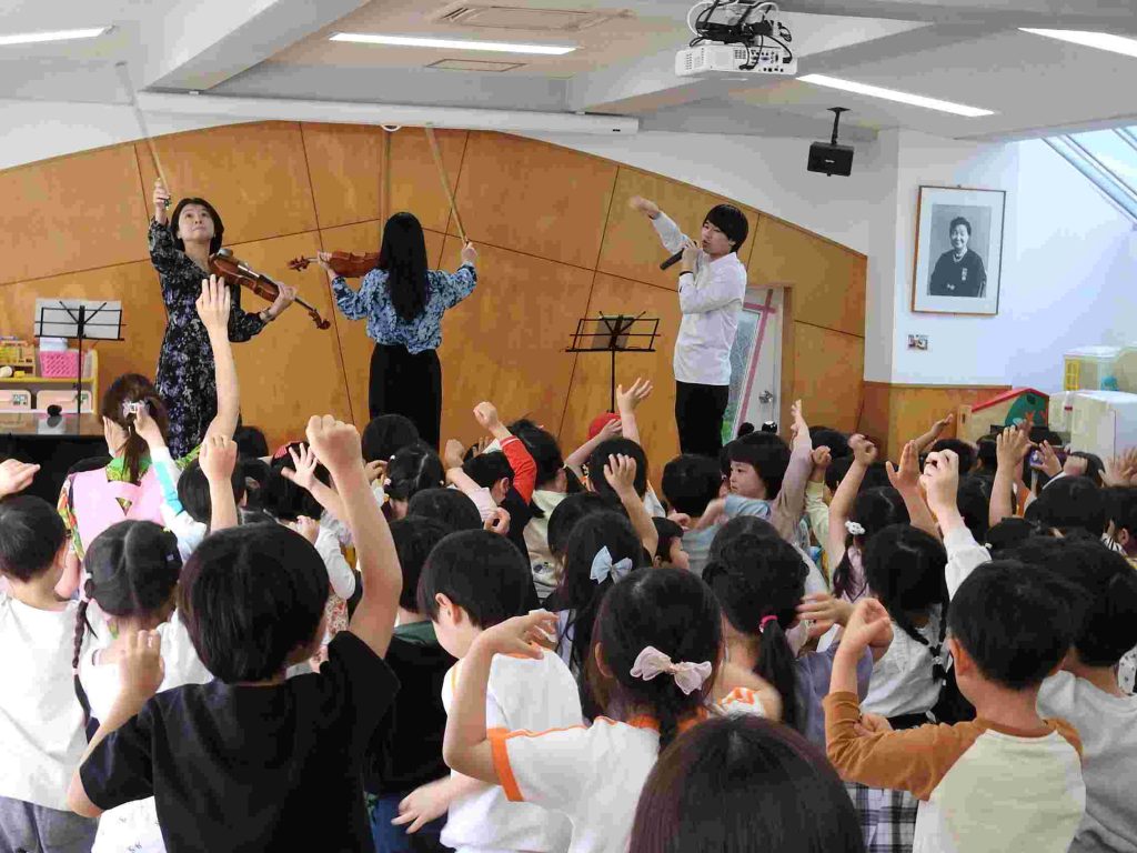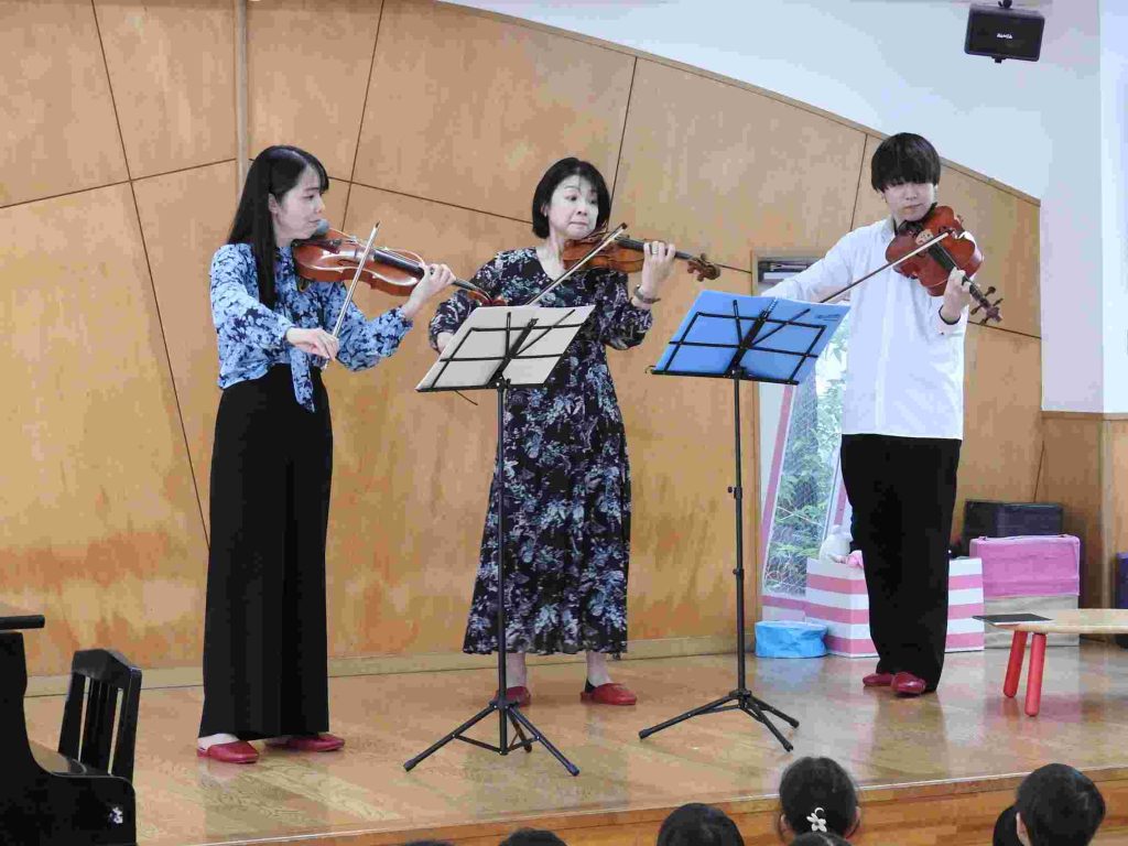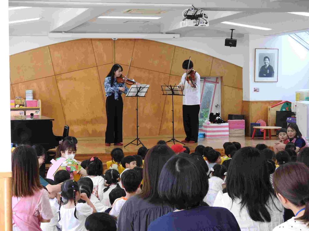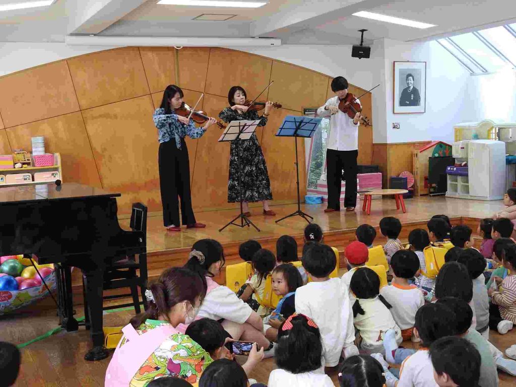 ムジコ音楽教室(高嶋ちさ子校長)の講師の先生方がミニコンサートを開いてくださいました。「さんぽ」「カノン」「アンパンマンのマーチ」を演奏してくださいました。演奏に合わせて楽しく歌うこともできました。5月からムジコ音楽教室が希望の園児を対象にして行われます。ヴァイオリンの音色が響くのを楽しみにしています。